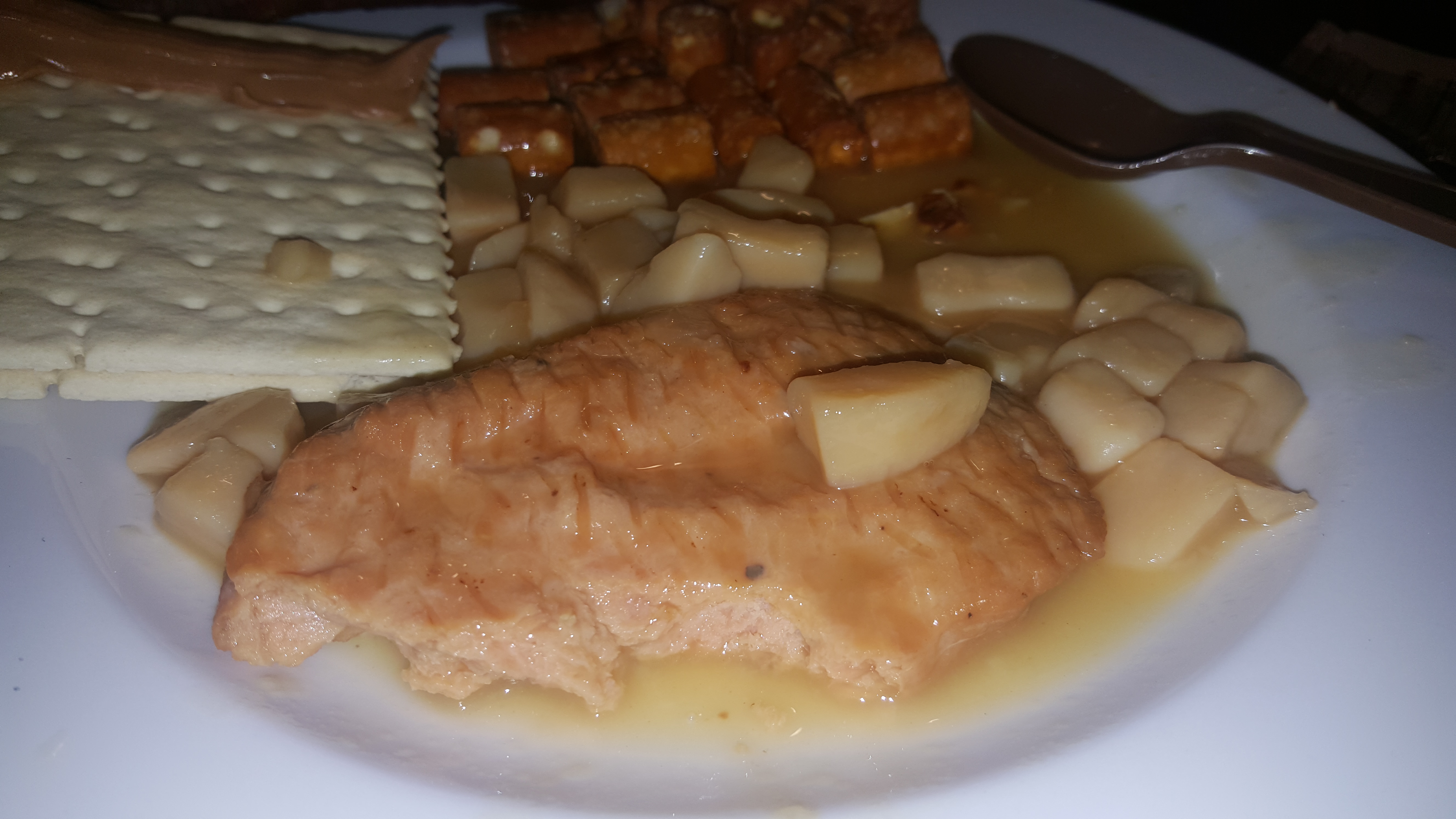 So let's start with the turkey breast. It came with quite a bit of gravy so when I poured it onto the plate, it pretty much soaked the crackers and pretzels. Not a big problem. The turkey itself tasted pretty odd. It's nothing like I expected. It was very processed and the chemical taste was strongly present. It was also pretty hard to cut. The potatoes were soft and the gravy was okay. Overall, I didn't really care for it. I wish they would have included mashed potatoes in this MRE instead. I think that would have made the experience a little better.