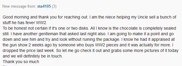 I would totally do that if we made an offer that was reasonable and cost per person wasn't nuts. I say that loosely we are talking about buy 75+ year old chocolate here so we are all a bit nuts! I'd be more willing to give the one that's already in the US a shot since It shows the chocolate that looks like it is in decent condition. Not even very bloomed by looks of it! Would be quite a expensive endeavor. Looks like there is eight pieces. Is there one disc of chocolate or two? Thinking one. If we can get a few people to commit... i'd be more than happy to get this out to the guys that pool the money together.