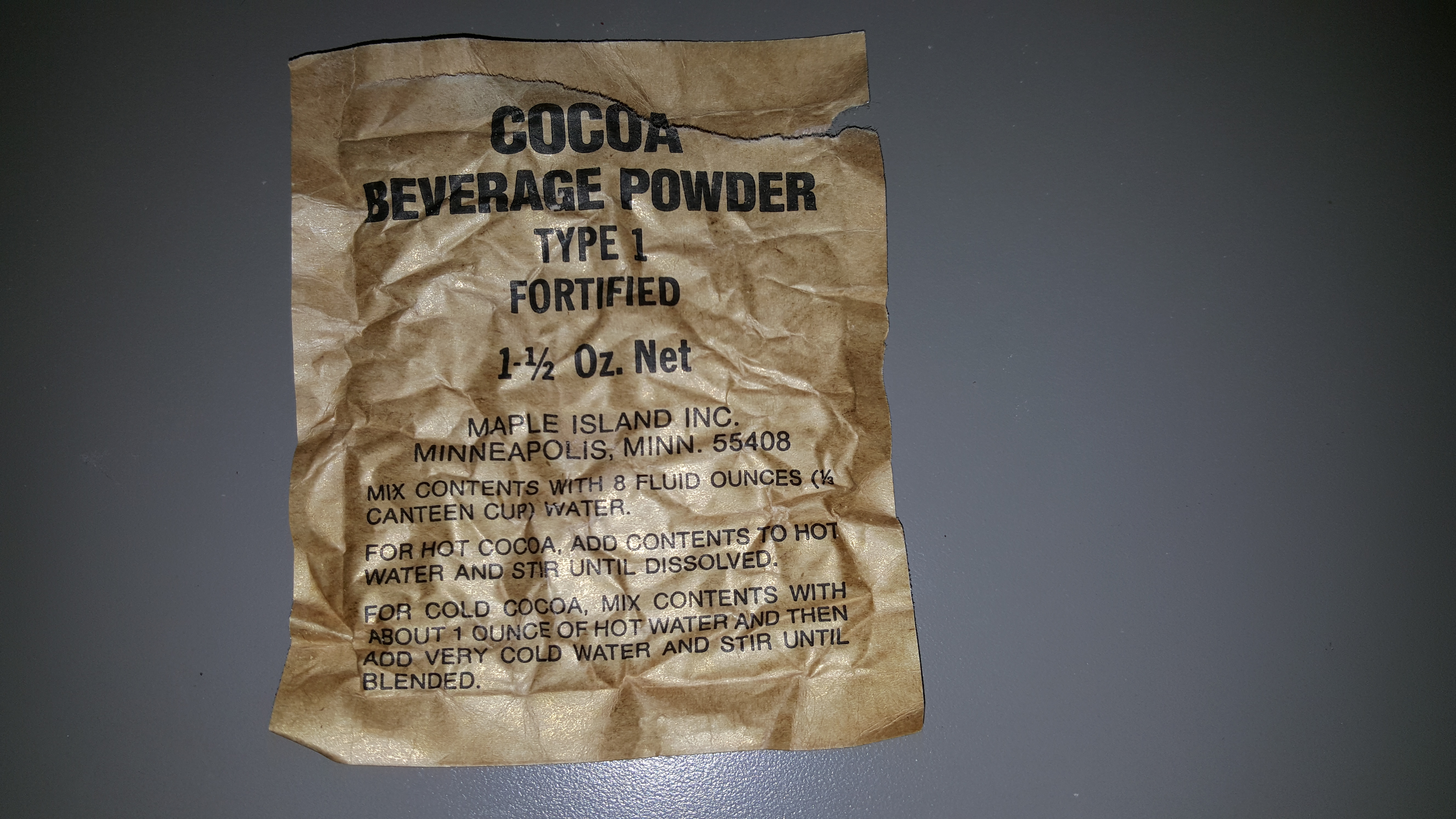 Then there was the B-2 unit. It had crackers and some cocoa beverage powder, hurray! The crackers were a toasted, salty and were still perfectly fine! I thought it was neat how they packed the cocoa powder in the can. The packaging was some odd, flexible waxed paper or something. Upon opening it, it passed initial inspections. After pouring water into it, I took a few sips but noticed that while it didn't taste bad, it tasted a bit off. In a way, it was a bit like spoiled milk so I didn't finish it.