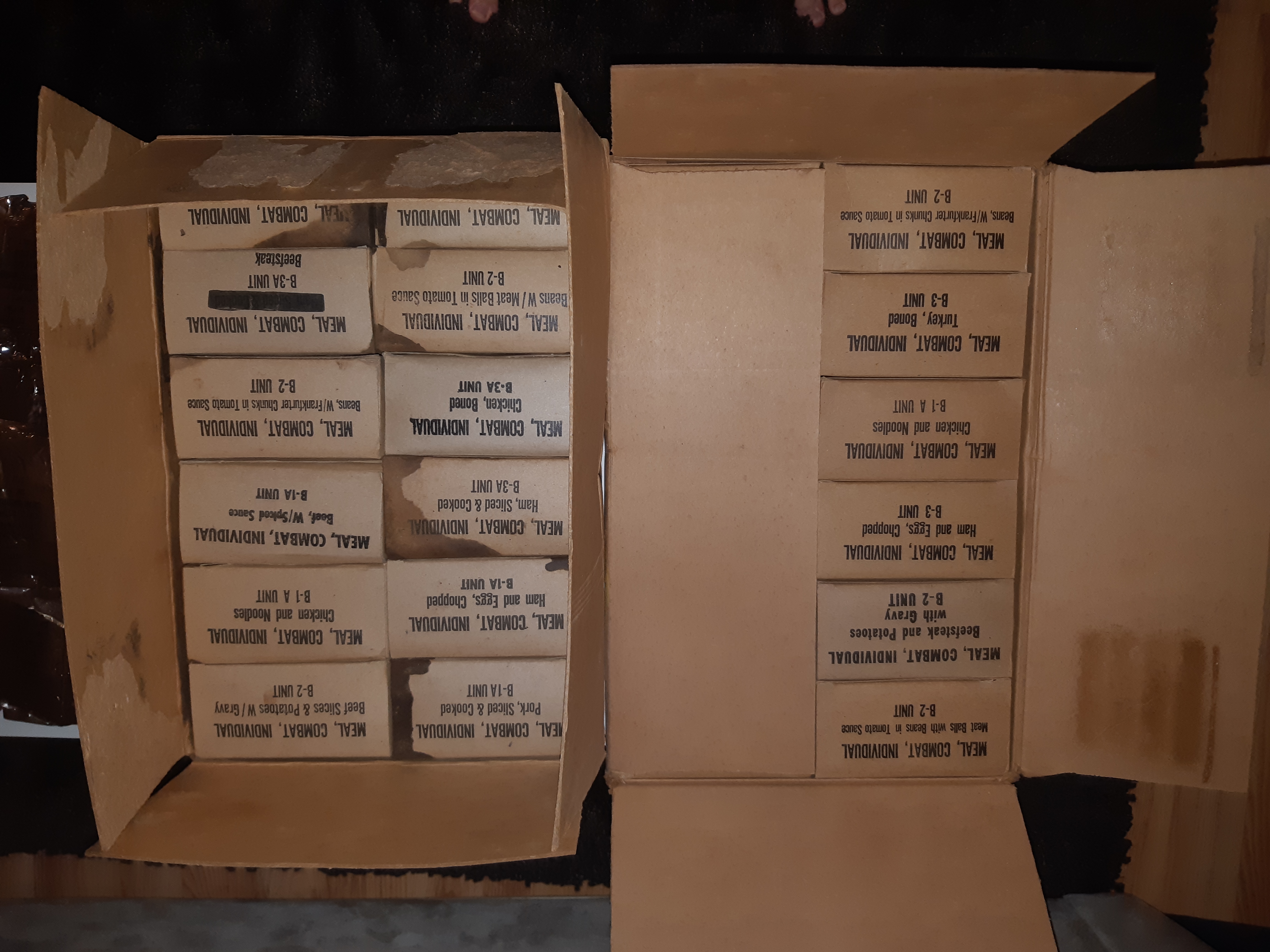 I got some pictures since cap174 Asked and decided to post them here, so you can see. The badly damaged boxes are the full ones, but i can transfer contents of bad boxes over to better condition box of the empty case. But i must state that the contents are not in a good condition, main cans and fruit cans are Almost all burst.