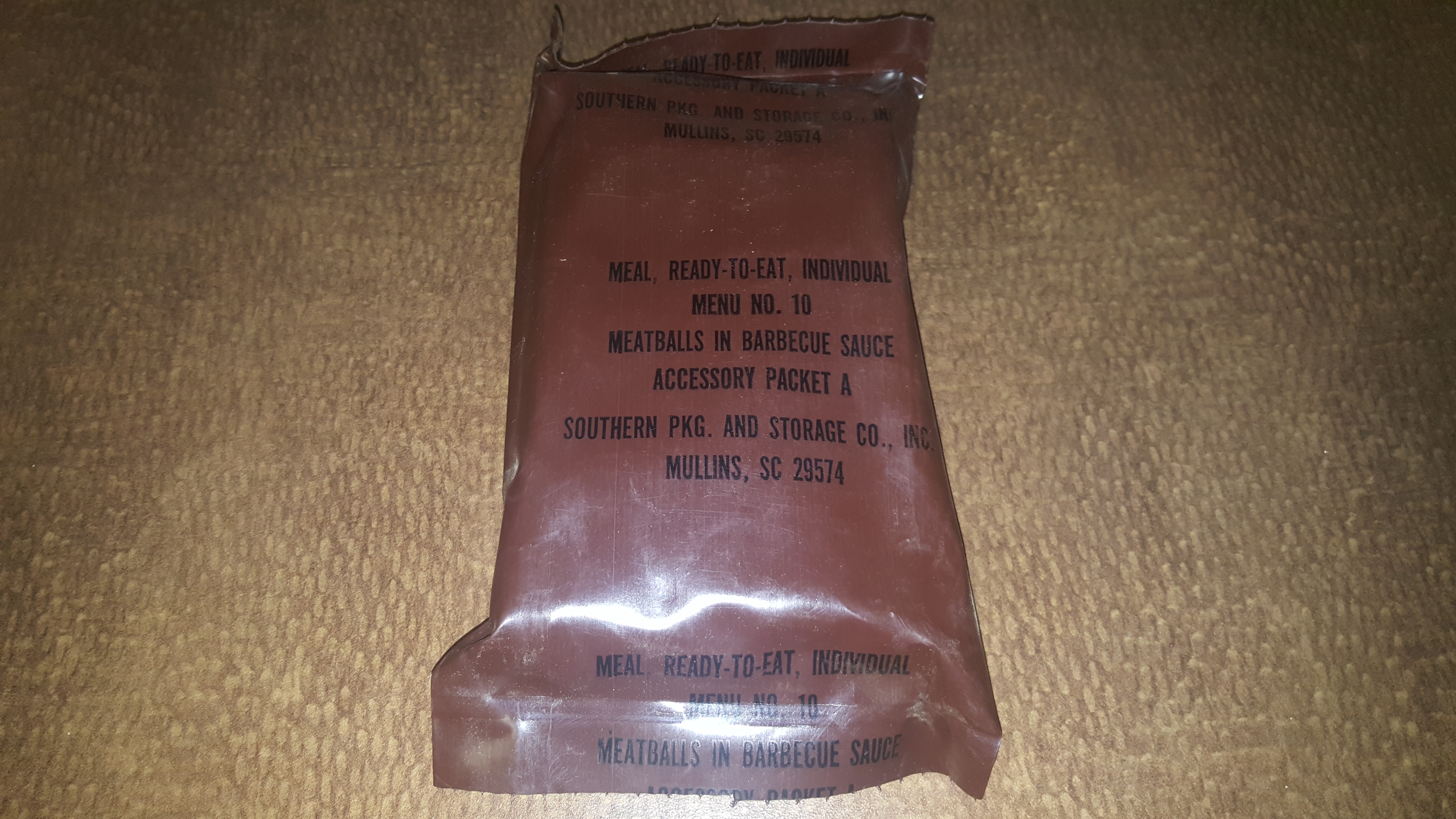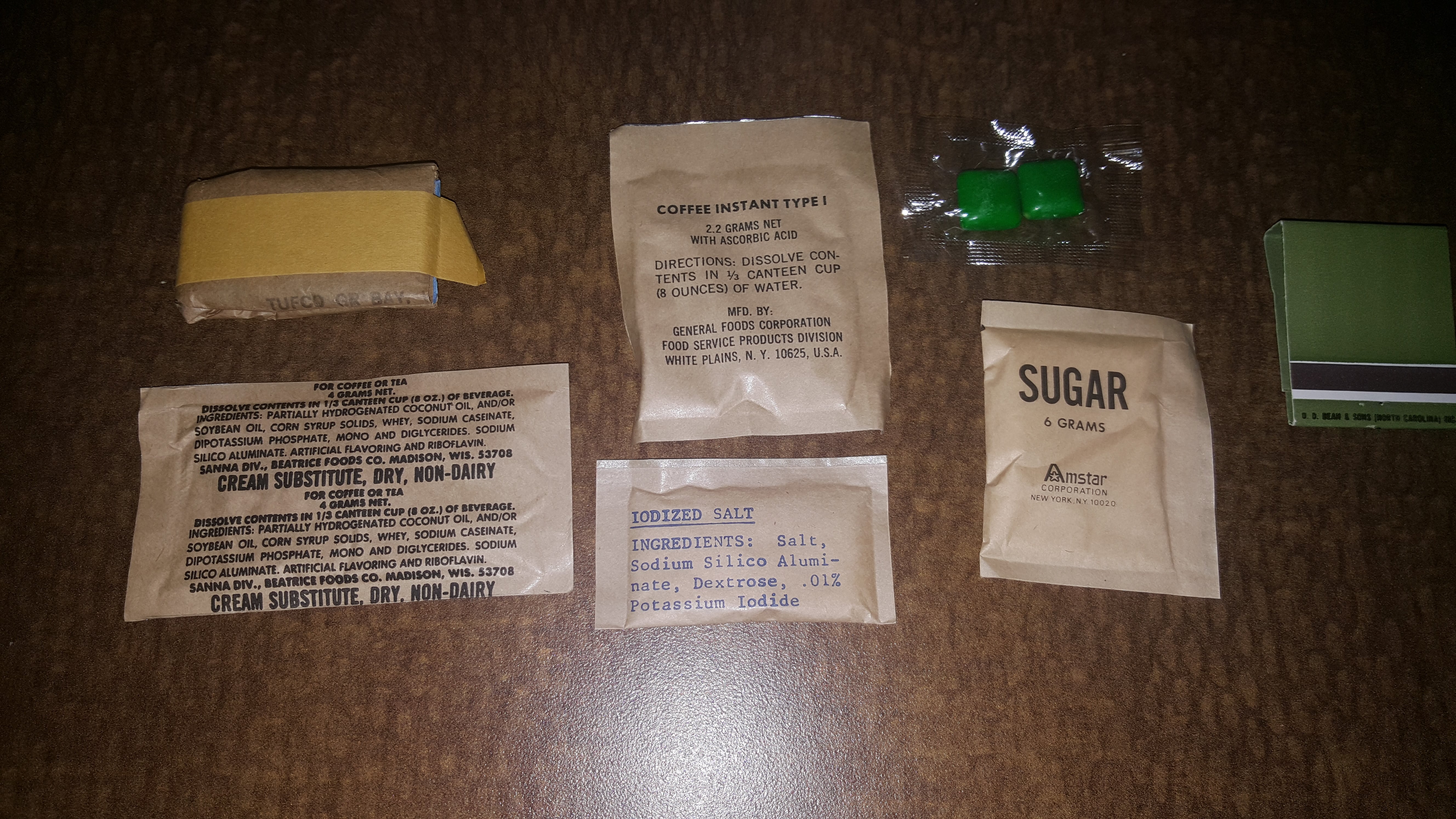 Here's a photo of the chocolate nut cake and the meatballs with barbecue sauce in their retort pouches: Here are the components of the accessory packet: Unfortunately, the creamer didn't make it. I had an extra packet of coffee and sugar so I added two packets of coffee instant type 1 and two sugar packets to it. Is it just me or does it look uniquely intriguing prior to adding water? It reminds me of baking. And here's the whole ration, prepared: The apple jelly looks somewhat fresh and wasn't too dark or liquefied. At the very bottom of the MRE case, I found an MCI sleeve. At first, I thought it had mysteriously found its way in there from my collection. But upon further examination, I think it came from the factory like this. I noticed that the edges look they've never been folded. And production of the MCI had stopped by around 1980. Were they just trying to get rid of the extras without discarding them? Or maybe it was just a mistake. Either way, I found this to be pretty odd. I boiled the chocolate nut cake and meatballs in their retort pouches for about 10 minutes. The meatballs smelled great and they tasted ok but after a few seconds, there was a subtle bitter taste on my tongue. As with the 1982 diced turkey MRE, I'm sure I could safely consume the rest of it if I were desperate enough but I don't feel the need to take my chances. Even if one were desperate, the other parts of the ration could be consumed for their caloric value. (assuming that I'm correct in understanding that food will lose its nutritional value over time but not its caloric value.)