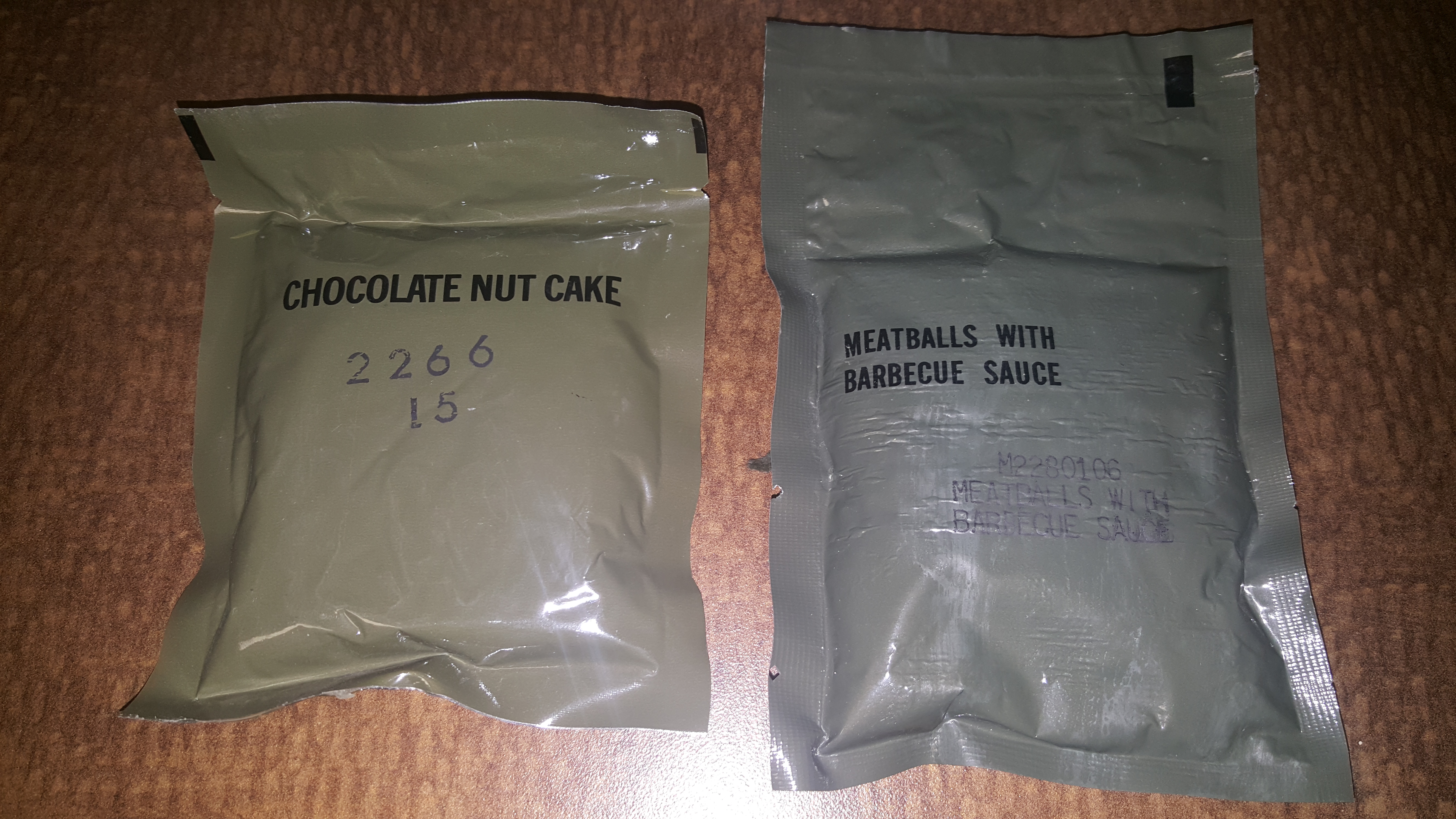If we take a look at all the items laid out, we have a chocolate nut cake, meatballs with barbecue sauce, apple jelly, crackers, potato patty, cocoa beverage powder, and the accessory packet.