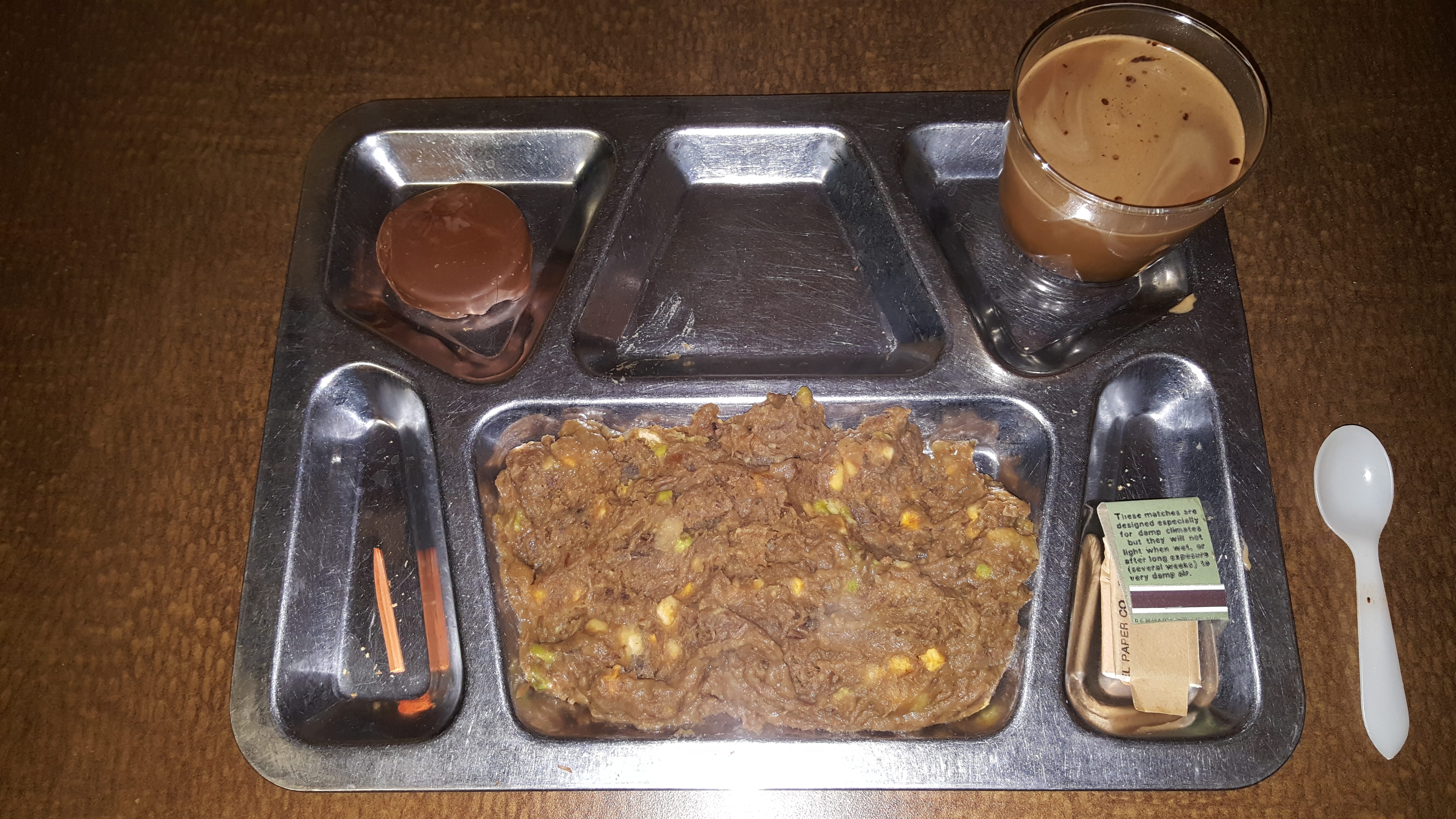 I'll admit that this particular menu didn't look too appetizing but it was actually still good! It comparison to the current production beef stew, this one was more salty and the beef was shredded rather than cubed. I'm sure there are other, subtle differences but aside from that, it tasted about the same. The vanilla fudge bar was as hard as a rock. I couldn't break it in half let alone bite into it. The mocha was great, however I think the coffee flavor is stronger with coffee instant type I and tastes more like it should. As far as the interdental stimulator goes, what a joke. For a meal like this, I believe dental floss would be more appropriate. For that reason, I would prefer the current production beef stew since it doesn't get stuck in my teeth and the the flavor is slightly more improved.