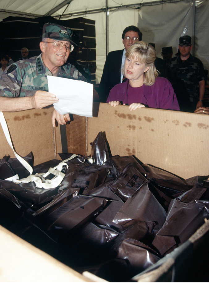 The new plastic-wrapped HDRs were developed in five months at the request of Defense Secretary Les Aspin, who wanted to overcome the problems that MREs often posed when they were used in humanitarian relief efforts.