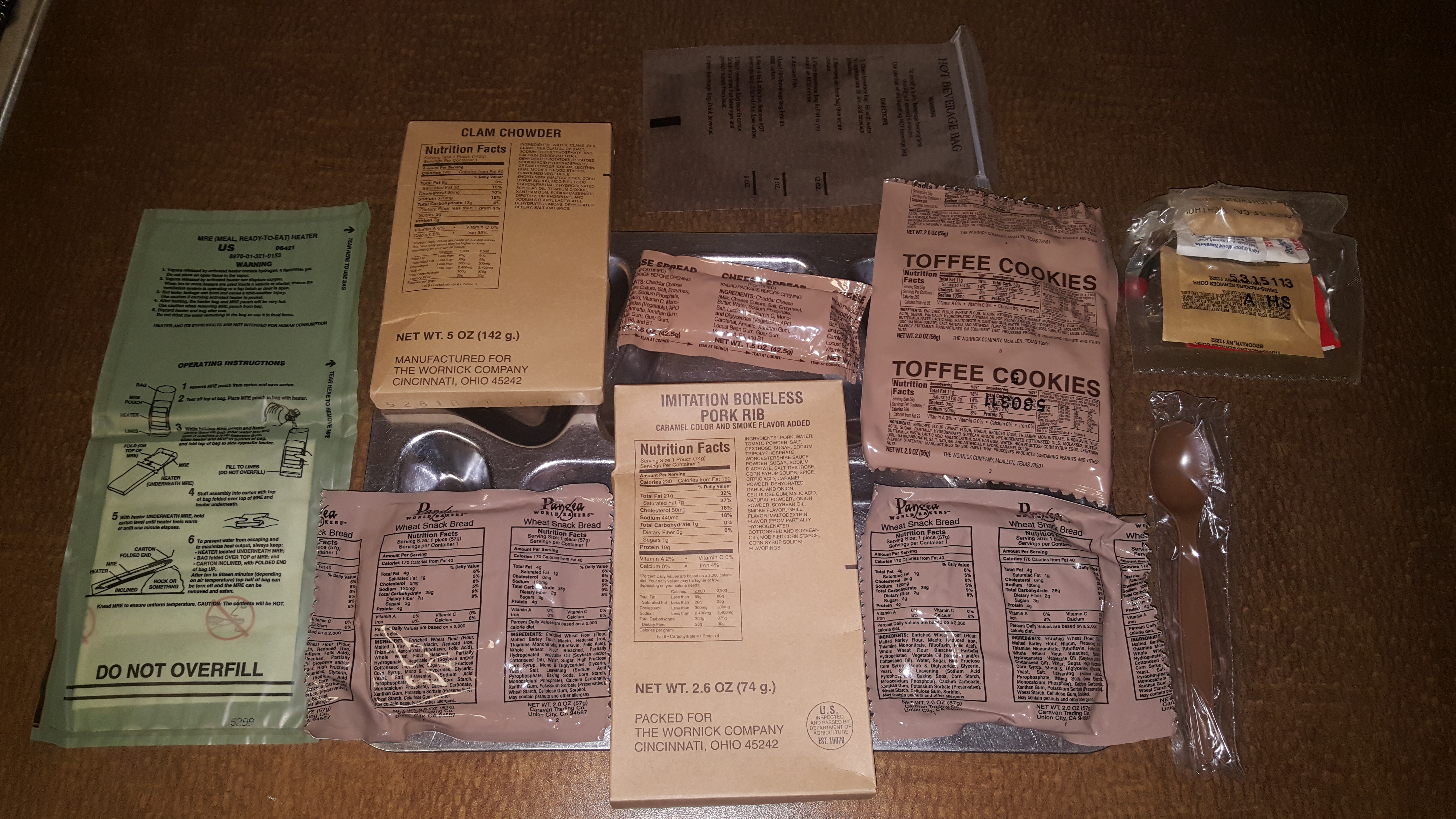 Here are the components laid out on a tray. This MRE includes 2 wheat snack breads, imitation boneless pork rib, toffee cookies, cheese spread, clam chowder, flameless ration heater and an accessory packet.