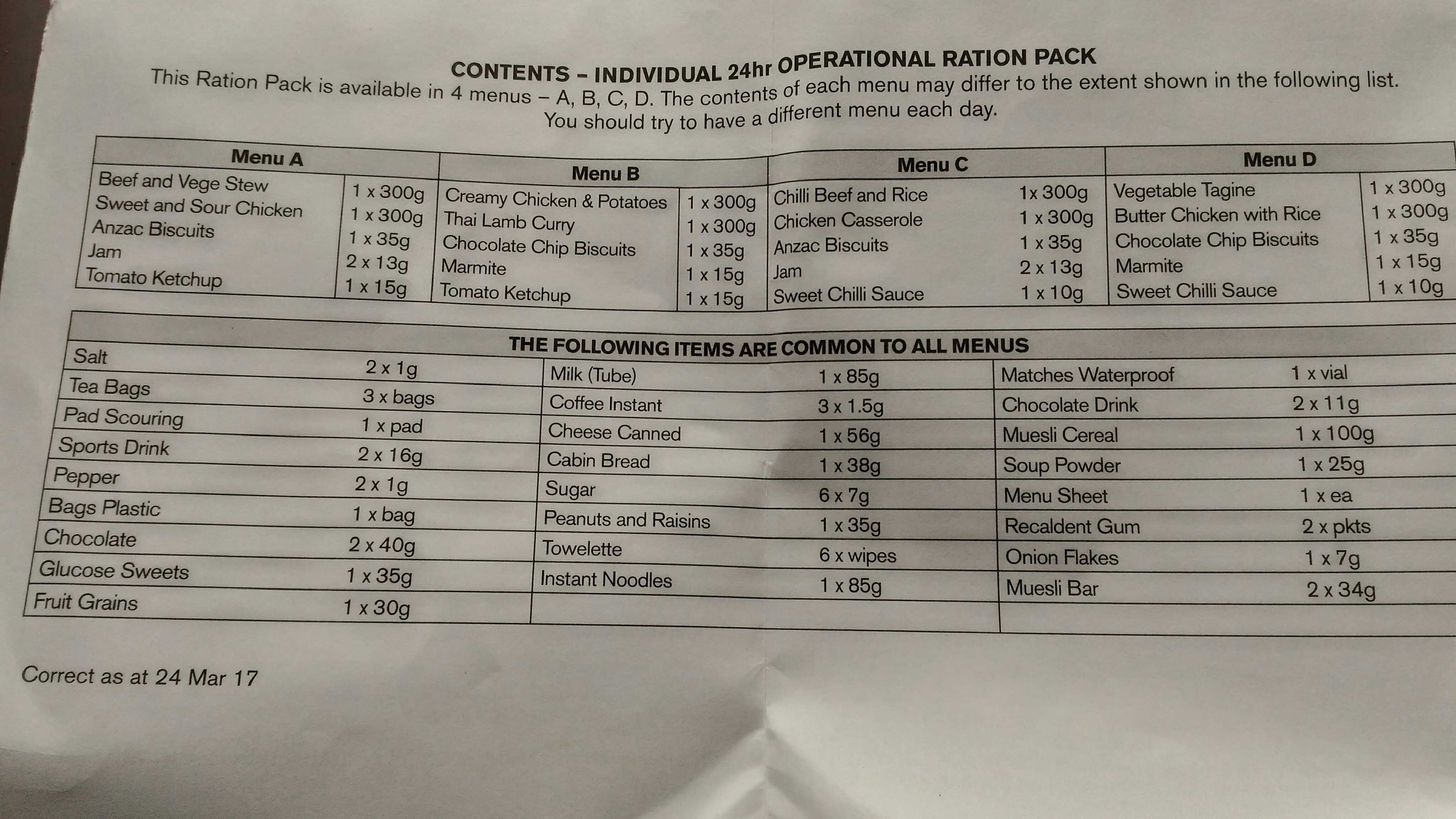 For example, the chicken casserole only has 16 ingredients, the most "artificial" of which is corn starch - basically a home cooked meal. Some components are exclusive to NZ ORPs, and are hard to find even in the civilian world, Milk chocolate with klinkers in a bar can only be found in these ORPs (as far as I can tell, looked a few weeks ago for some) the only thing similar I've been able to find is a massive klinker with a thin chocolate shell.