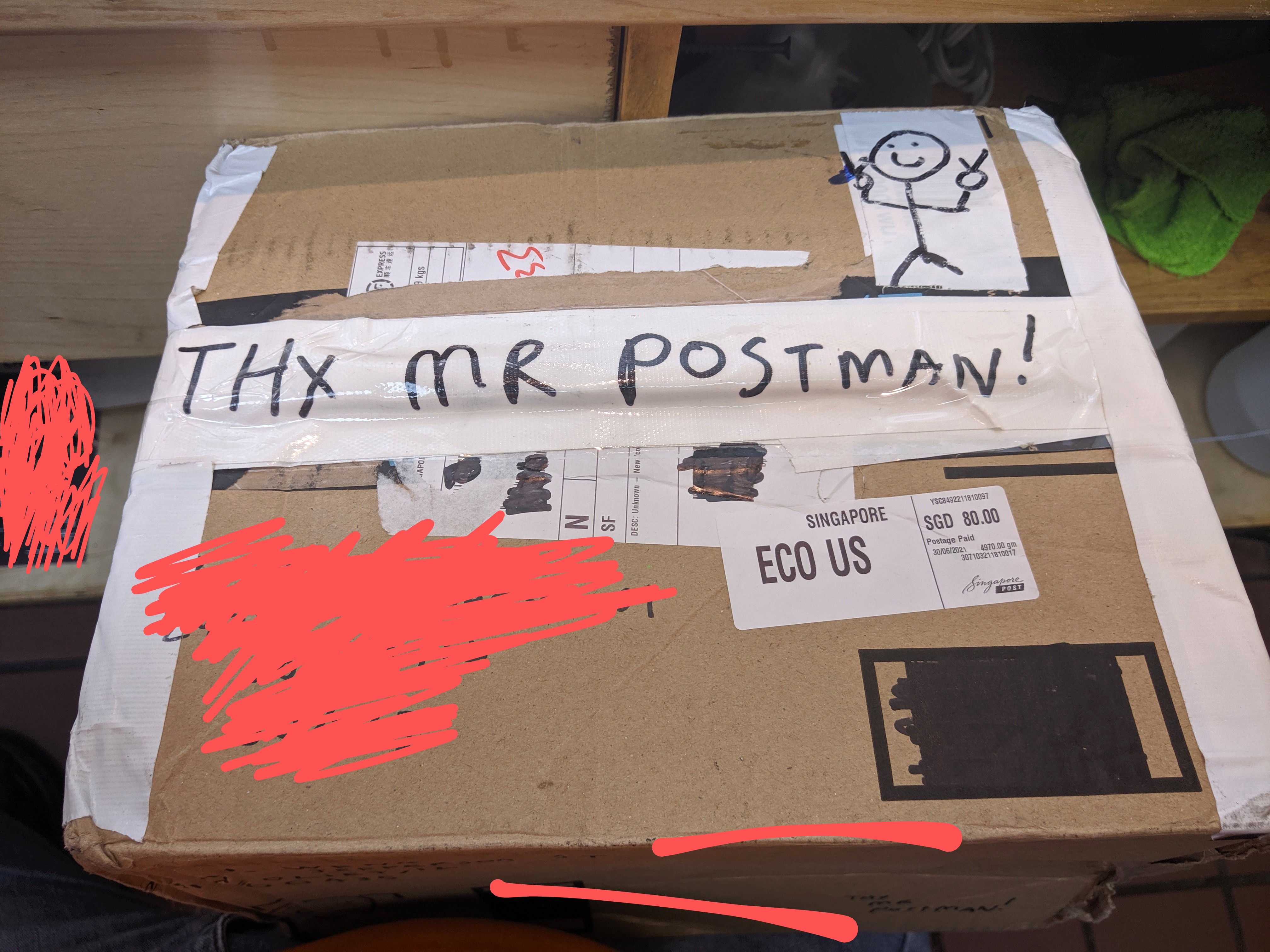 Box was a little crushed from USPS and Singapore Postal. Not a big fan of the colored duct tape but it worked well holding the rest of the box together, tore some of the box off from the actual ration even after attempting to not pull off the color and paper.