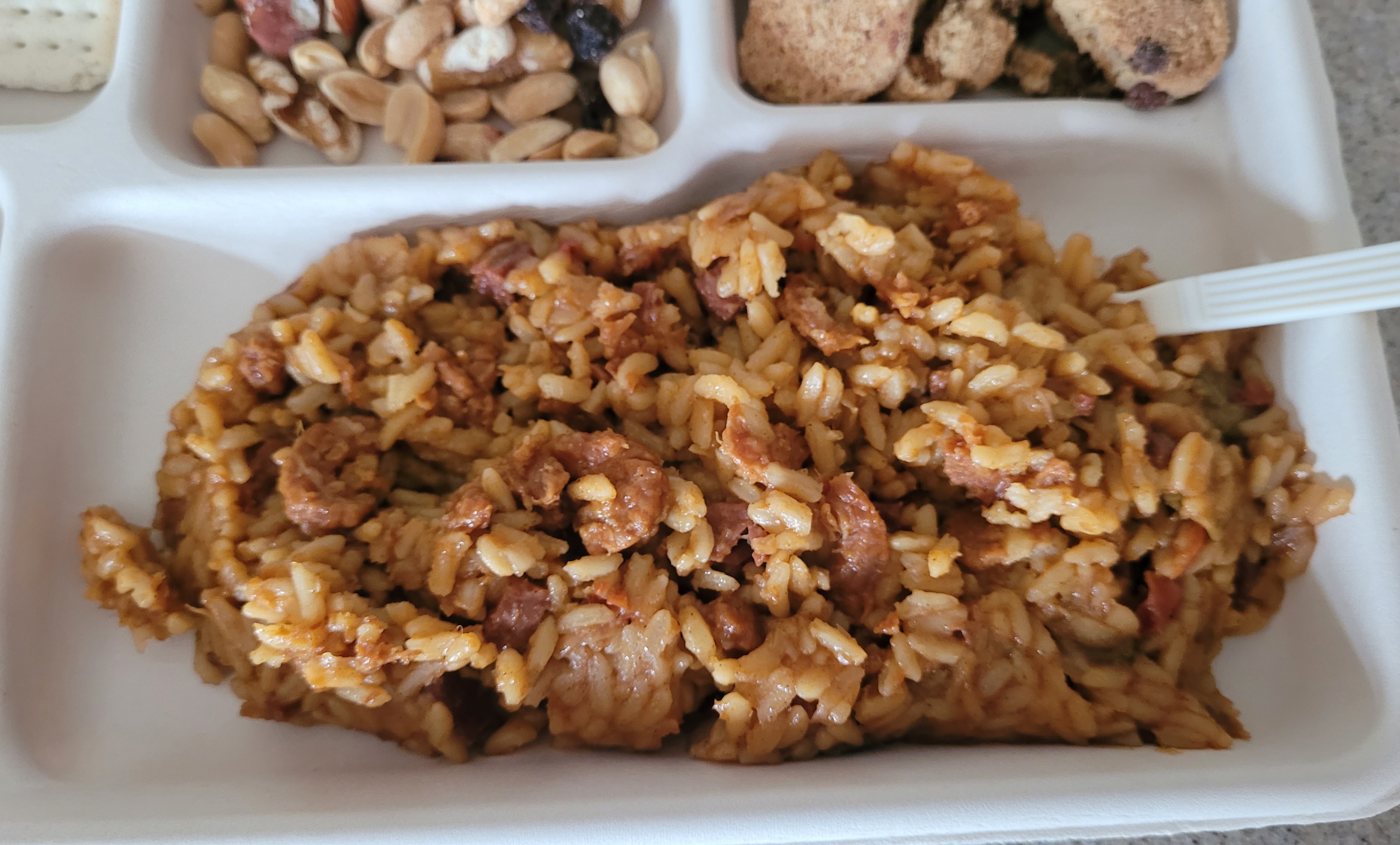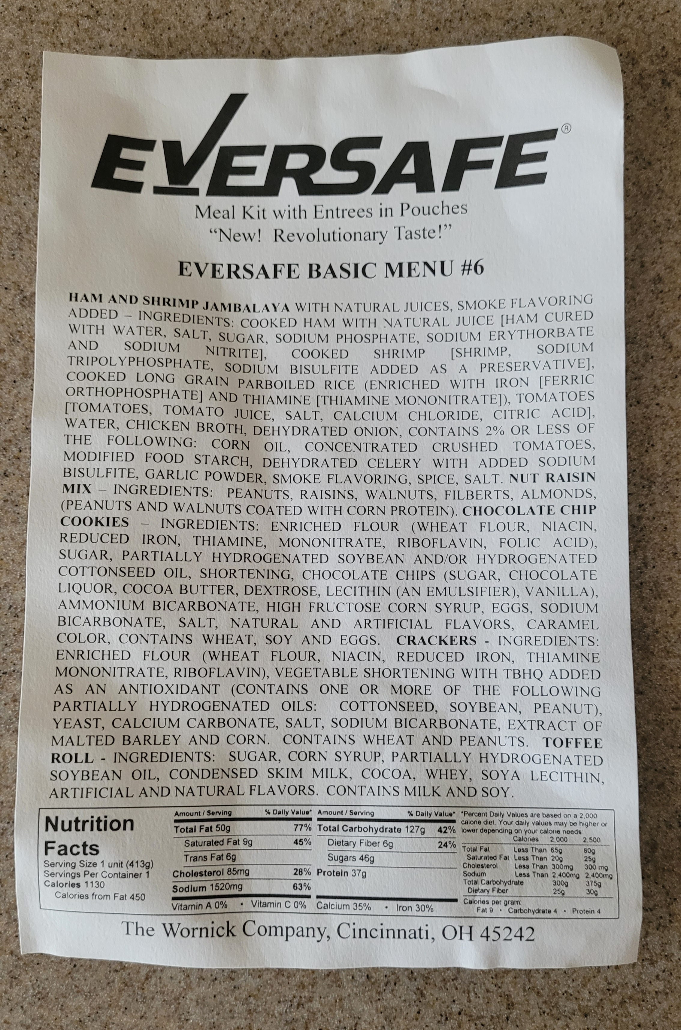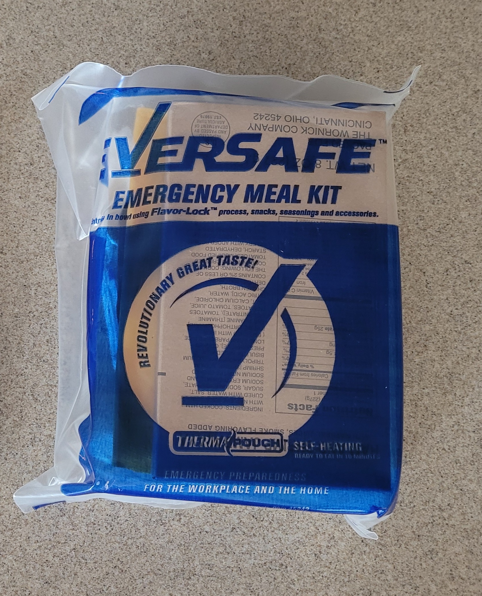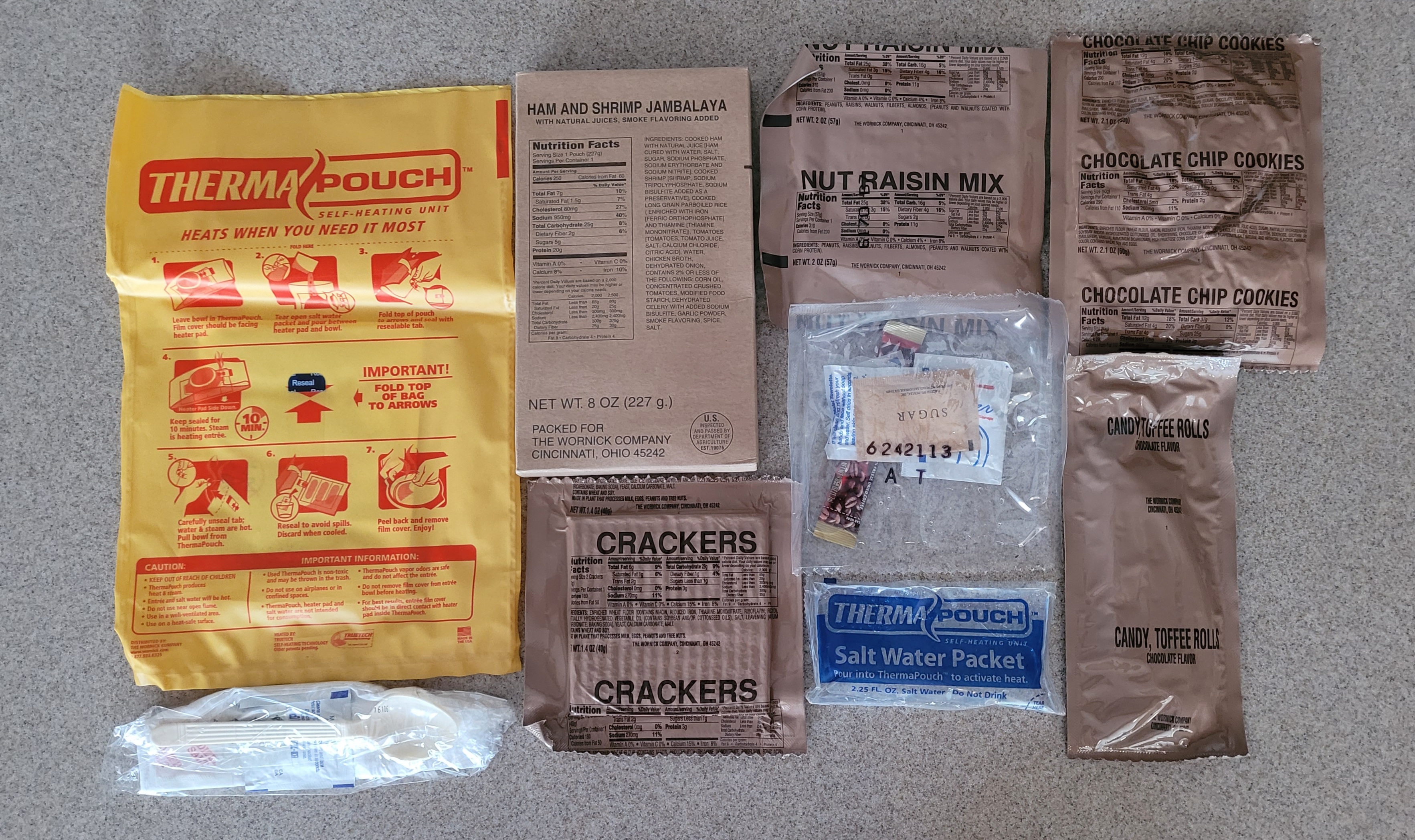 Today's lunch, a 2007 EverSafe Emergency Meal Kit menu 6 Ham and Shrimp Jambalaya. Was a little leary of this main because of the shrimp, but this meal held up really well. The jambalaya had a nice smokey flavor and had a good bit of ham and shrimp. I was surprised to find the meal still had a chew to it, not just a mushy pile. All other components were still fresh and tasty. I was a bit disappointed that it did not come with a spread for the crackers, but I put them to use eating the jambalaya