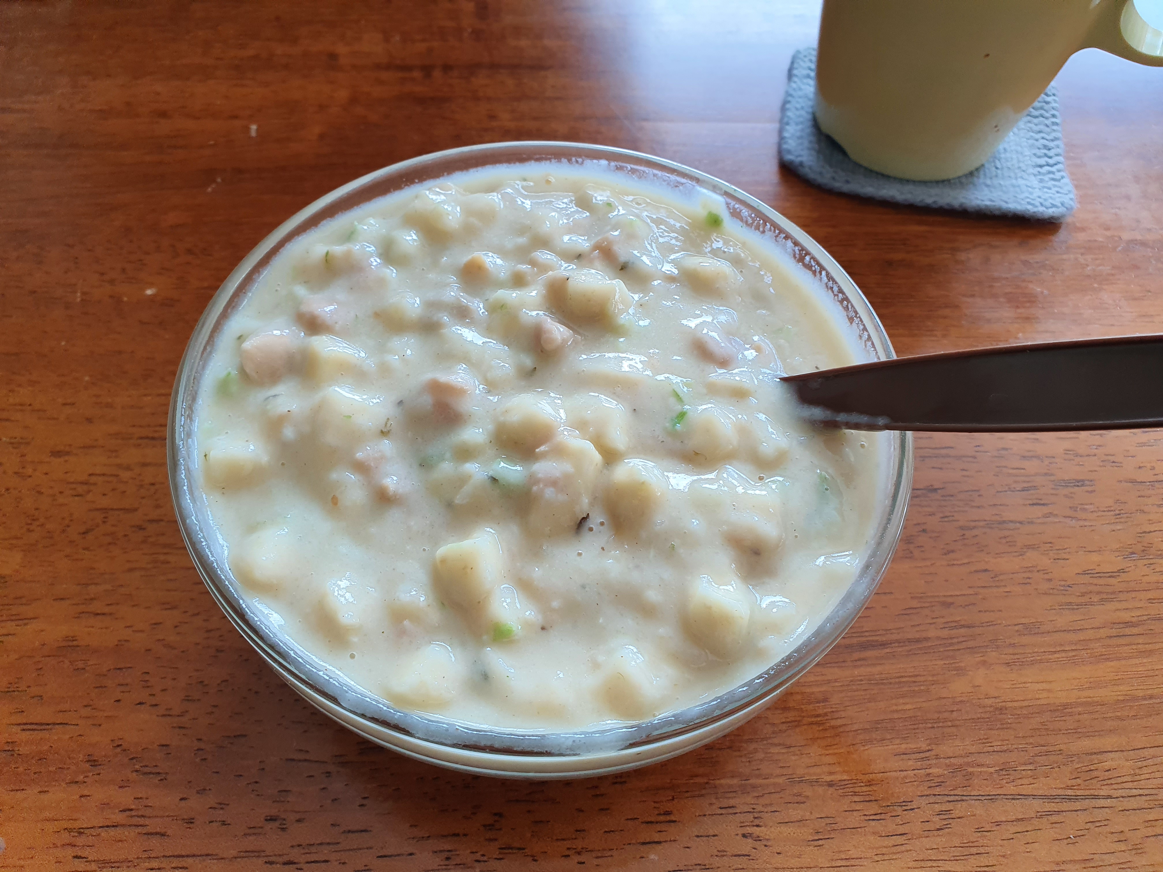 Closeup on the Seafood chowder, i like adding the hot sauce for this meal