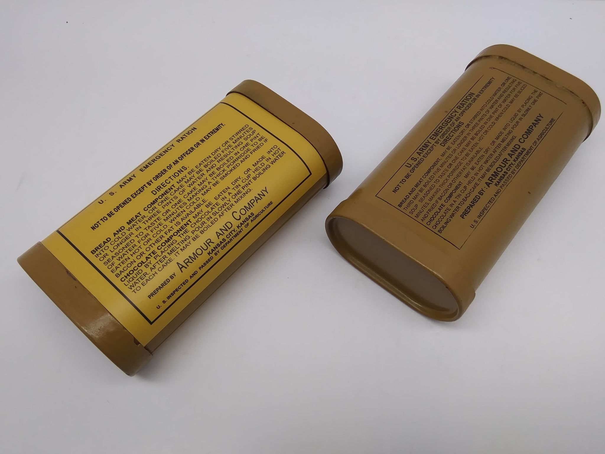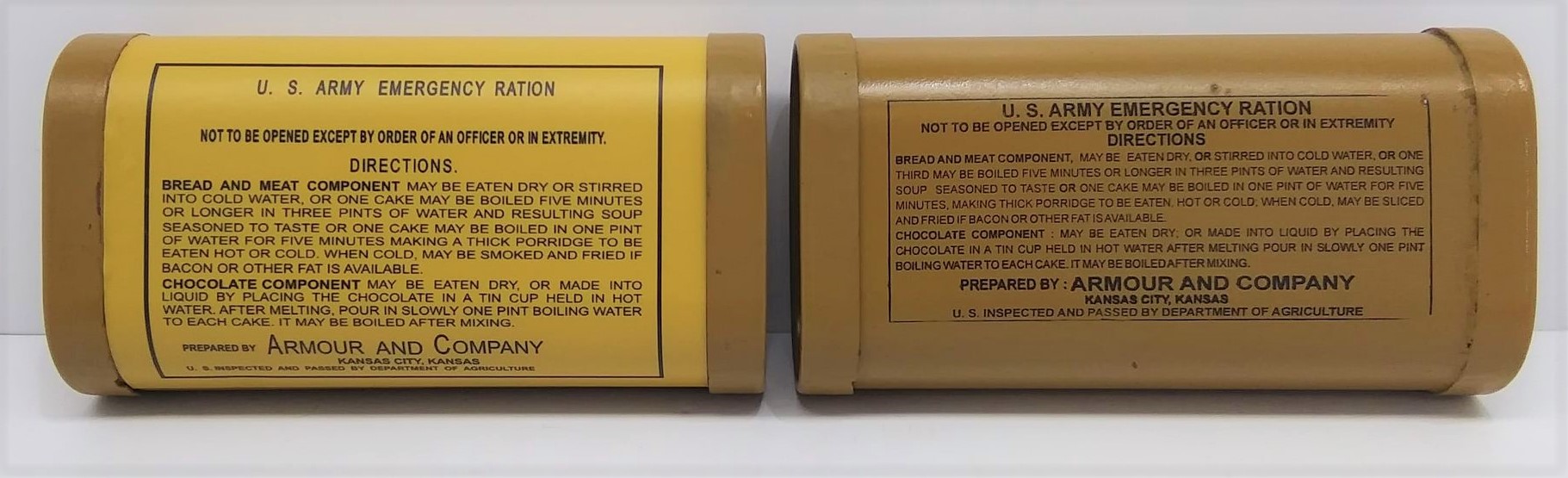 These photos are of production version decal sheets affixed to a WPG Emergency Ration tin. While the originals were painted on, the decals are thin and mimic the appearance of painted/ lithographed markings quite well (see photo comparing a painted tin vs a tin affixed with a decal.