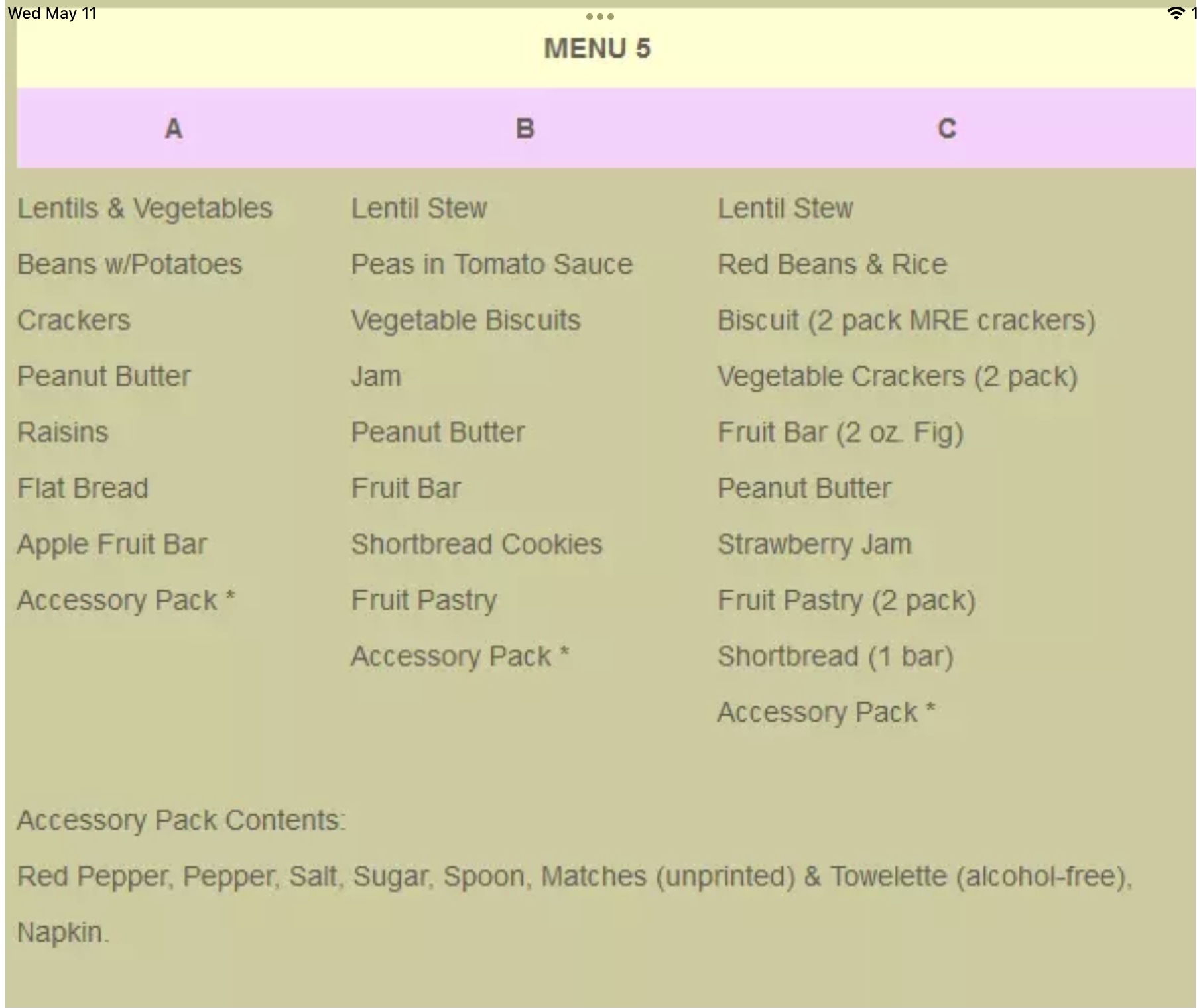 All of the meals follow menu B on the lists below, with the exceptions that in every meal the “Fruit Bar” has been replaced by an Oatmeal Cookie and the “Fruit Pastry” is an unfrosted brown sugar toaster pastry. All the jams are strawberry.