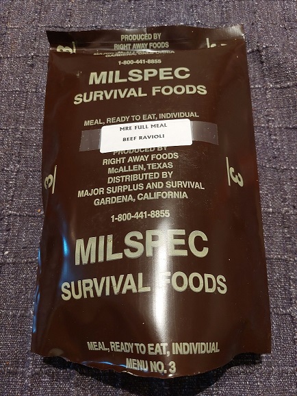 -All meal pouches are labelled "Menu No.3" "Beef Stew". However, there are taped on printed labels with menu names which appear to be accurate. Ie., The printed label said "Beef Ravioli", which is exactly what was inside the Menu No. 3 "beef stew" pouch.