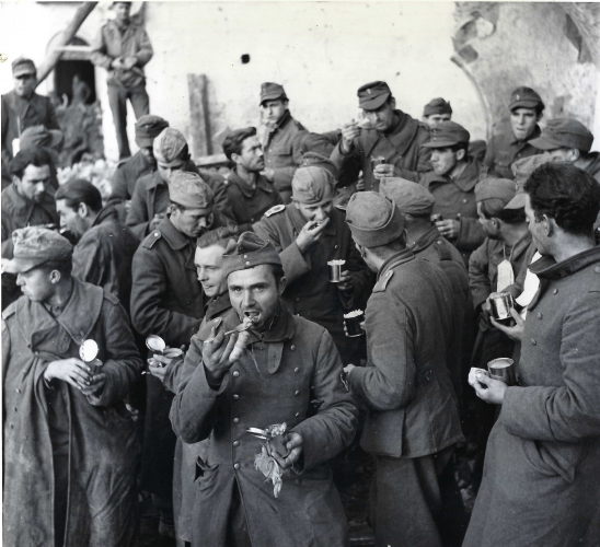 Here's a photo of German POWs eating C Rations behind American lines in Italy after getting captured during mountain fighting near Casino. They're eating M and B units from what looks to be 1943 DoP - lacquer coated cans.