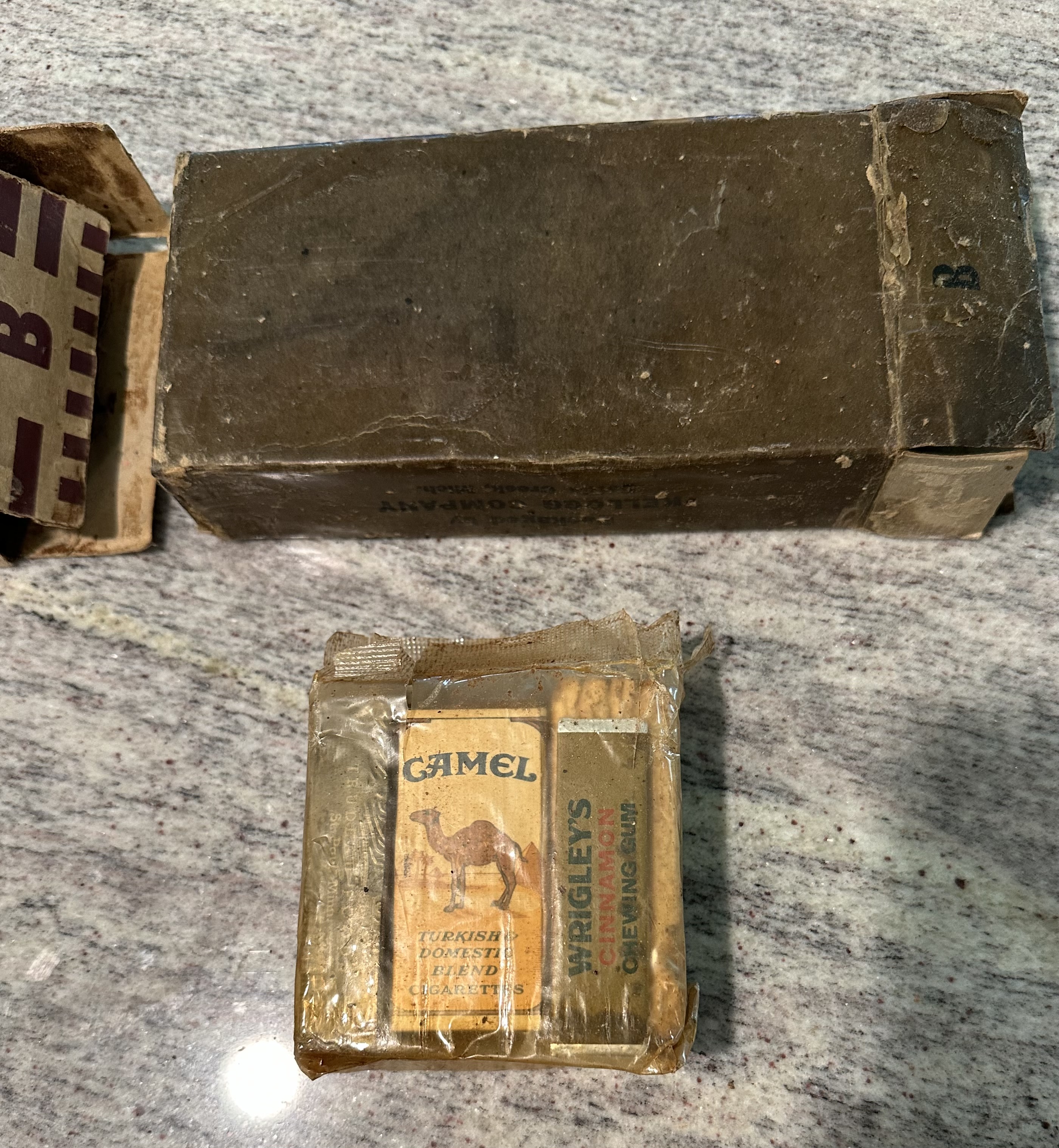 1. Food Packet Individual Assault, Menu 4. This ration is open and has seen better days, but to my knowledge it is complete. The main has been compromised and the fossilized remains are inside the can. The B unit is in fantastic shape and is sealed, dated 1952. The candy (Vanilla Caramels) and fuel tablets are both closed with some damage to the containers, but I did not open them to check their condition as I don’t want to damage the paper or foil. The accessory packet is opened and complete, unfortunately it appears bugs have gotten to most of the coffee and soluble milk packets but they still display great. The other contents are in good shape and the Camels are still sealed. All in all, a decent complete example of a very hard to find ration.