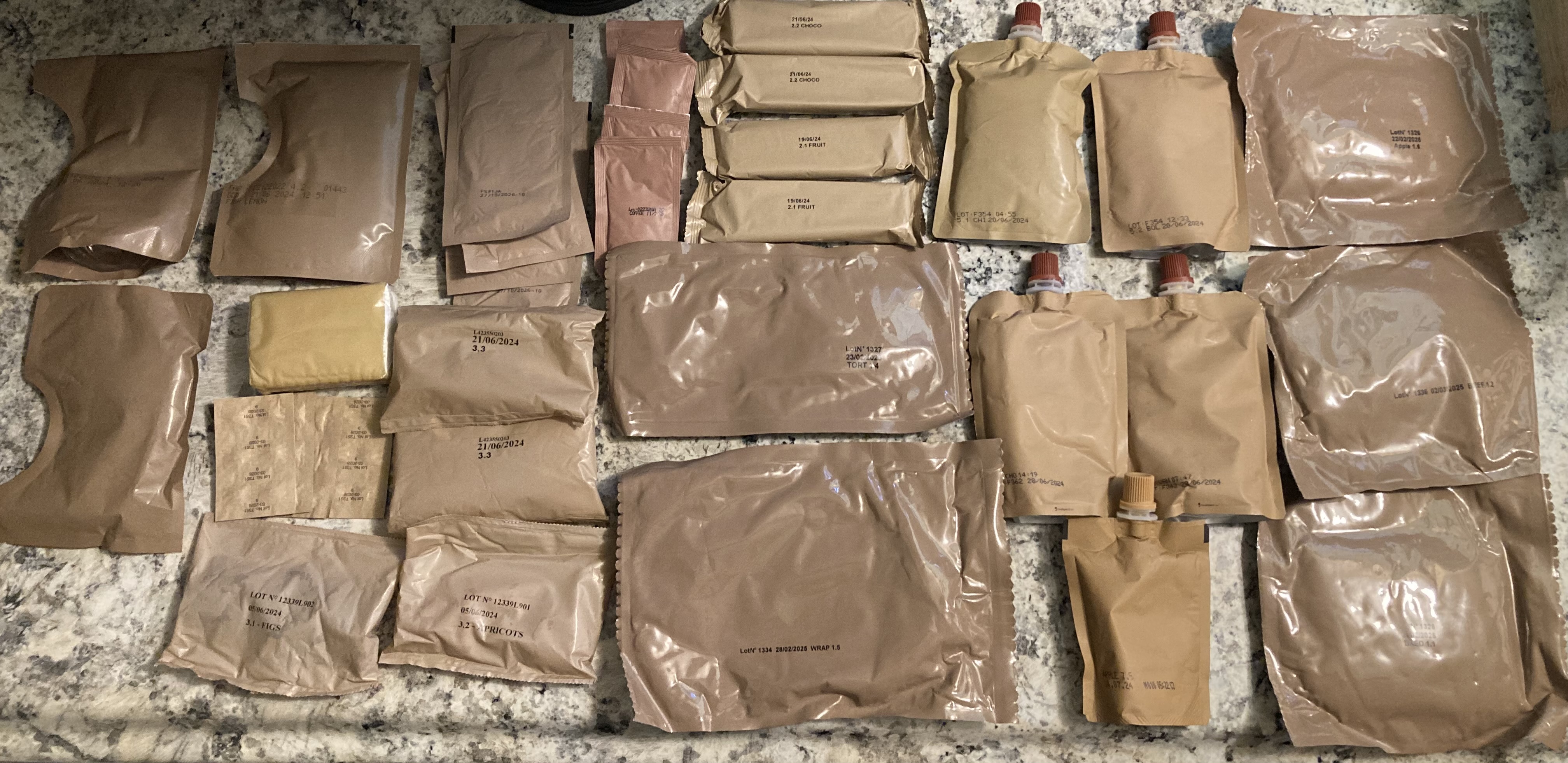 Here are the items from the “24H first strike ration” in the black bag. This is essentially the French version of US FSR which is filled with easy and quick to eat snacks, wraps, sandwiches etc. Pretty cool in my opinion. I’ll get to the green bag ration soon too.