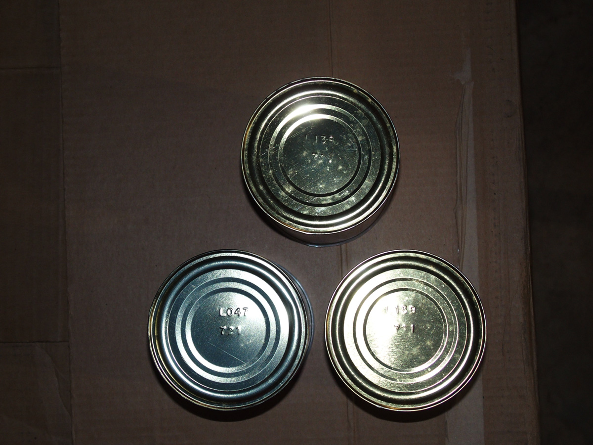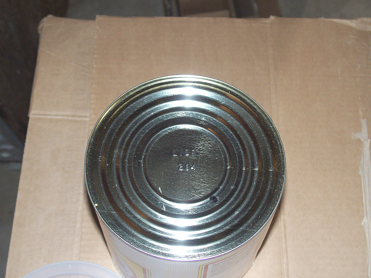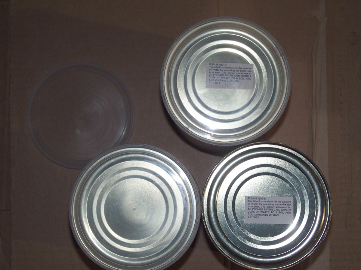A #2-1/2 Can of Chili Mac and a couple of #2-1/2 Cans of Freeze Dried Potatoes & Beef. Note the "correction" pasted to the bottom of the cans of Potatoes & Beef. All of these are "L" date codes indicating being packaged in 1981.