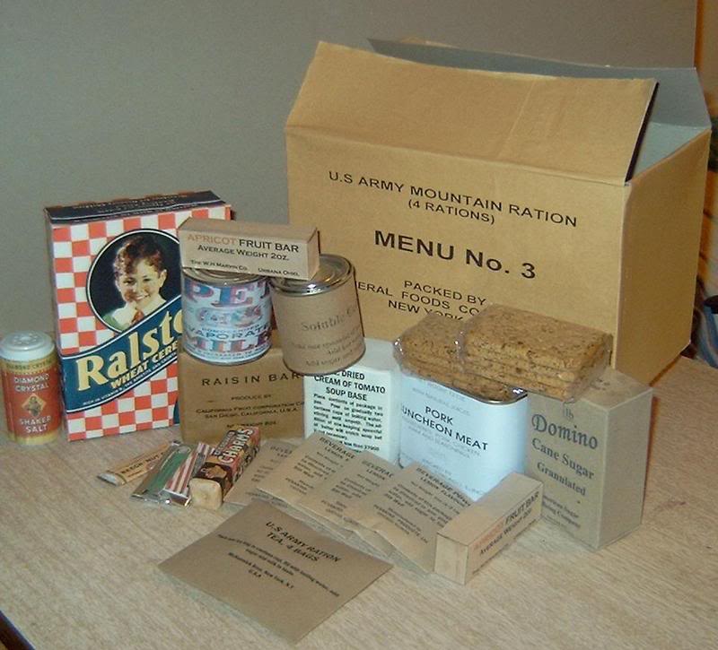 Thank you so much for doing research on that one!donaldjcheek wrote:The US Army Mountain Ration was a more successful experiment. The ration, like the Jungle Ration, was a group ration designed to feed four men for one day. It made heavy use of dehydrated, pre-cooked foods that were nevertheless high in calories, easily prepared, and both tolerable & easily digested at high altitudes. The ration weighed about 40 oz (per person) when broken down and provided 4800 calories if all items were consumed. Three menus were available: