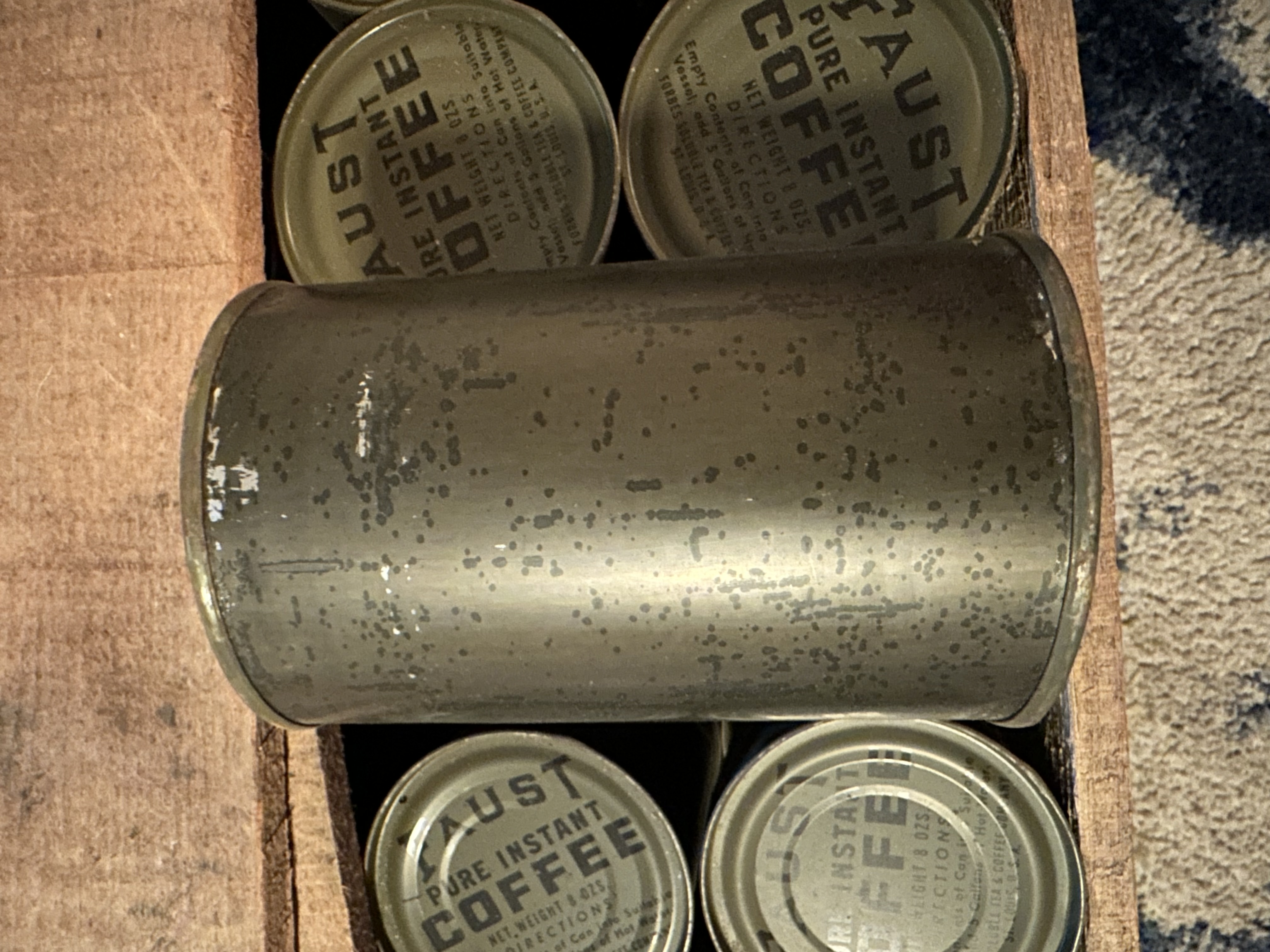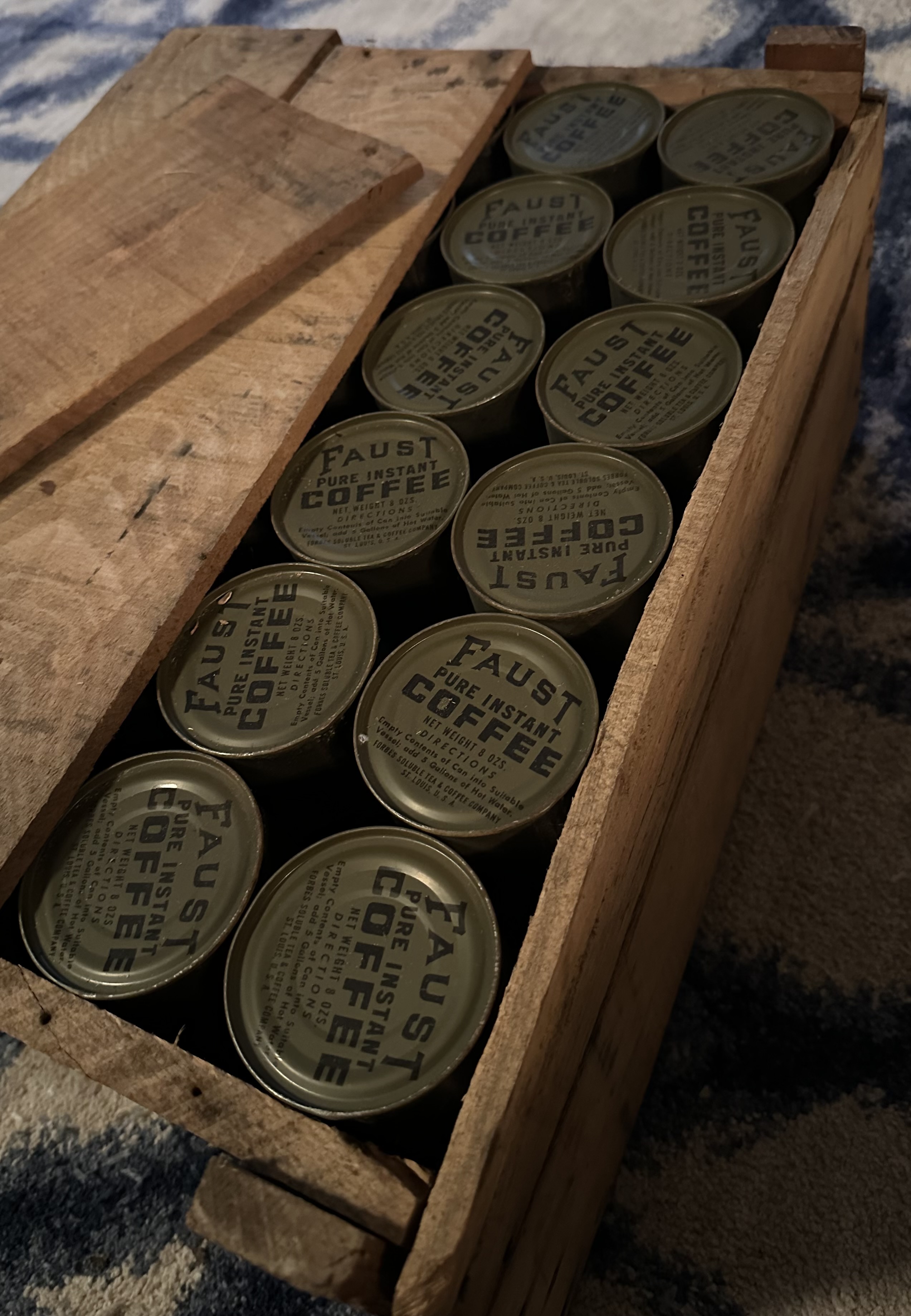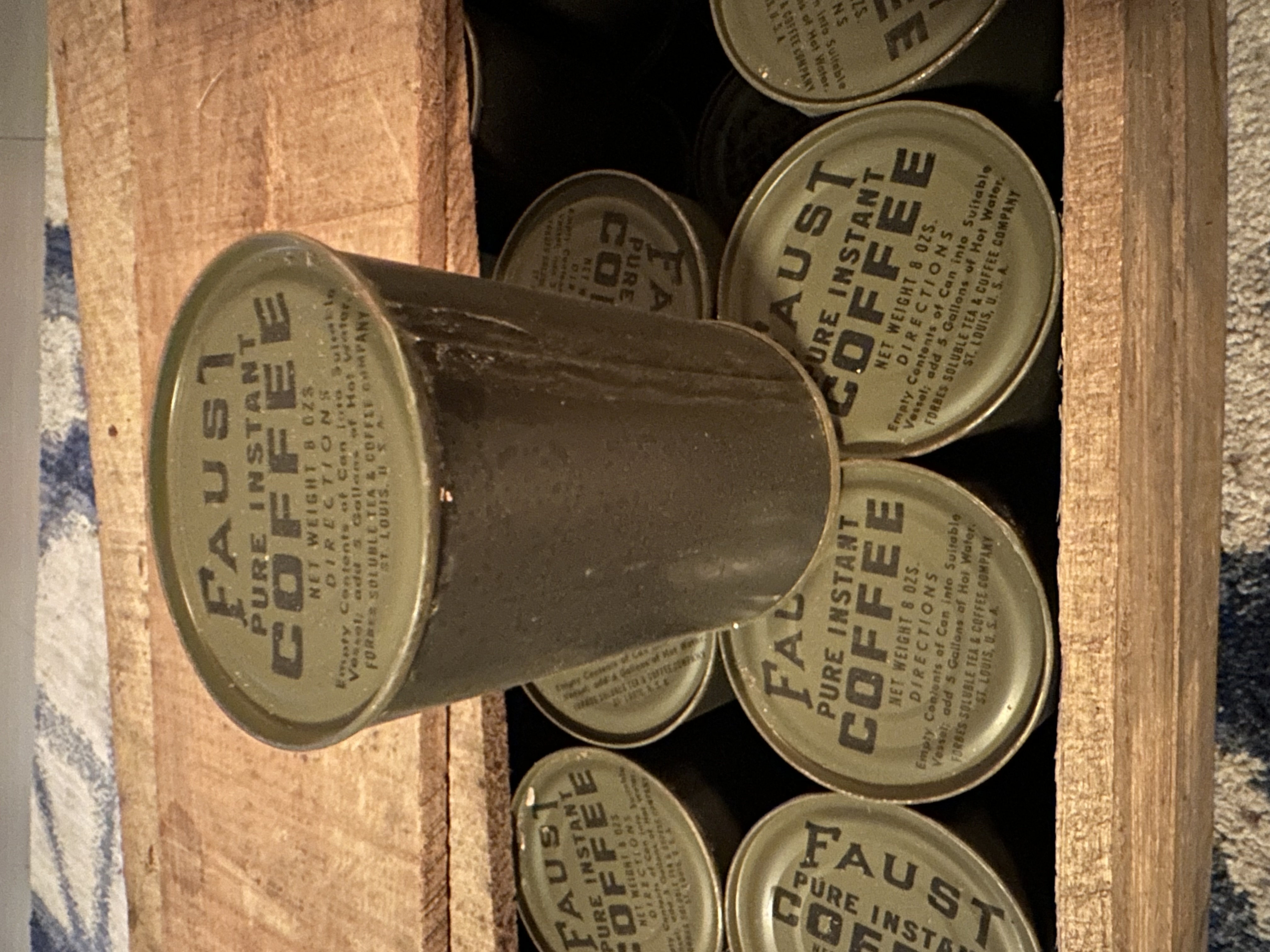 Hey everyone, I’ve got a bunch of sealed Faust Coffee cans for sale! The crate dates these cans between March-June 1945 and they were produced by the Forbes Soluble Tea and Coffee Company. The cans have some normal wear for their age but are in overall great condition and the coffee inside is dry and loose. I have them listed on eBay, but am offering them here for a discount since eBay takes a good chunk for themselves.