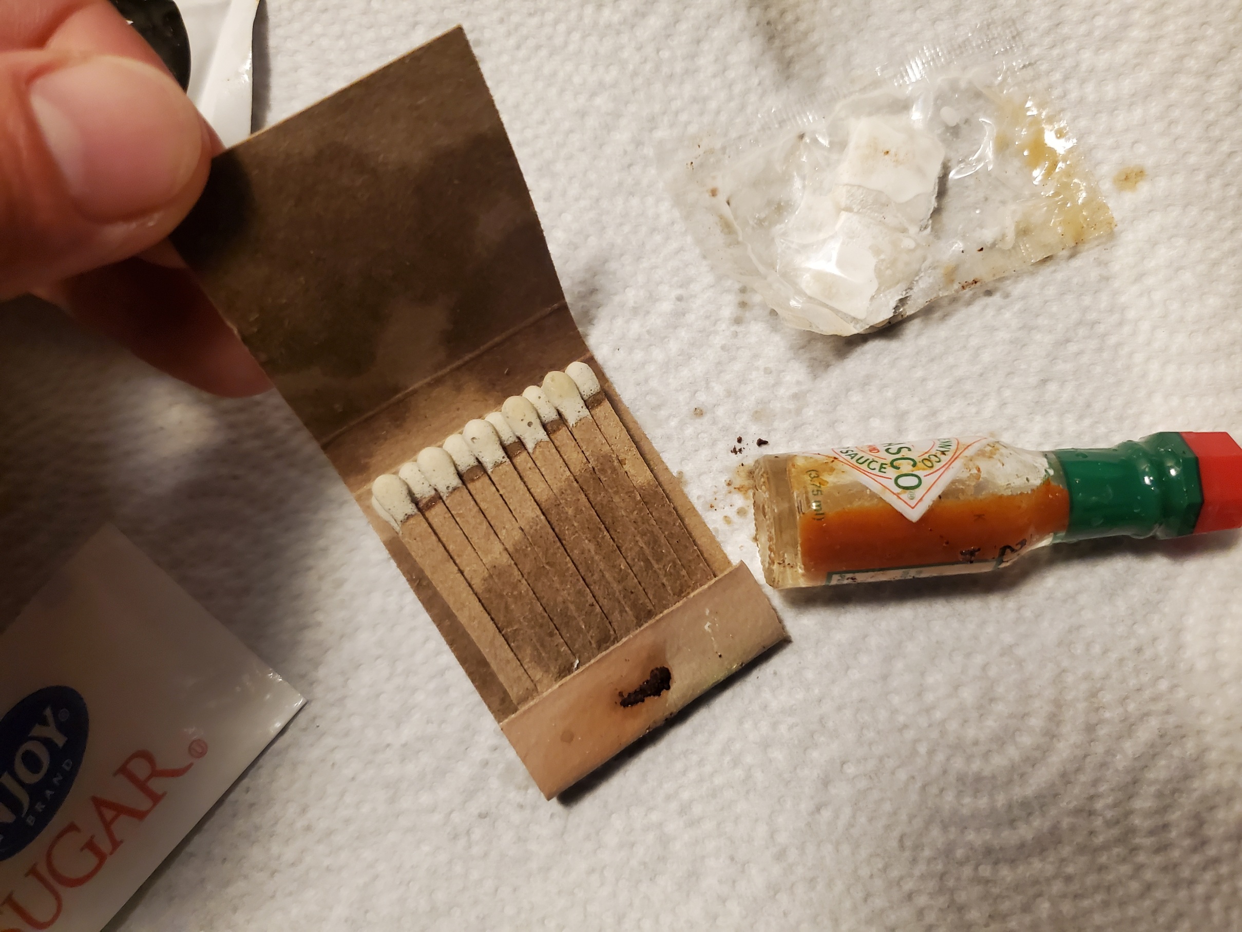 Failed vacuum seals & leaking Tobasco bottles. They need to bring the packets back, I suppose. As fun as those little bottles are, they're less reliable. At least the return of them. Old school ones never really did that.