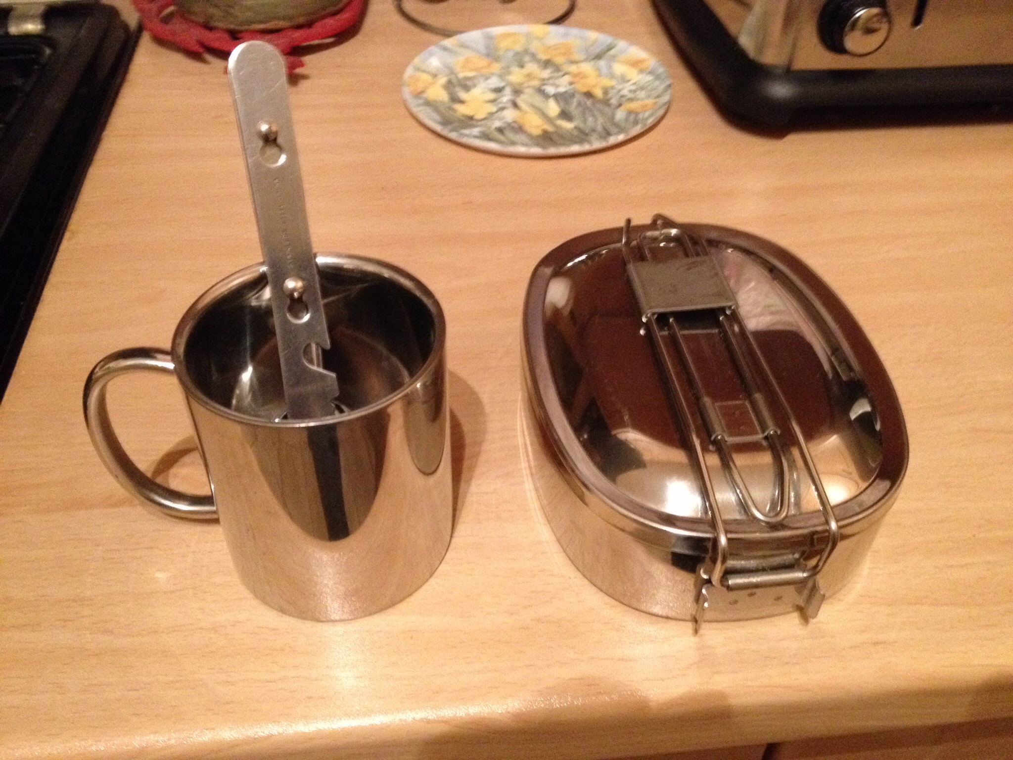 Stainless steel mug, origin unknown, K.F.S. and the BCB Crusader mess tins.