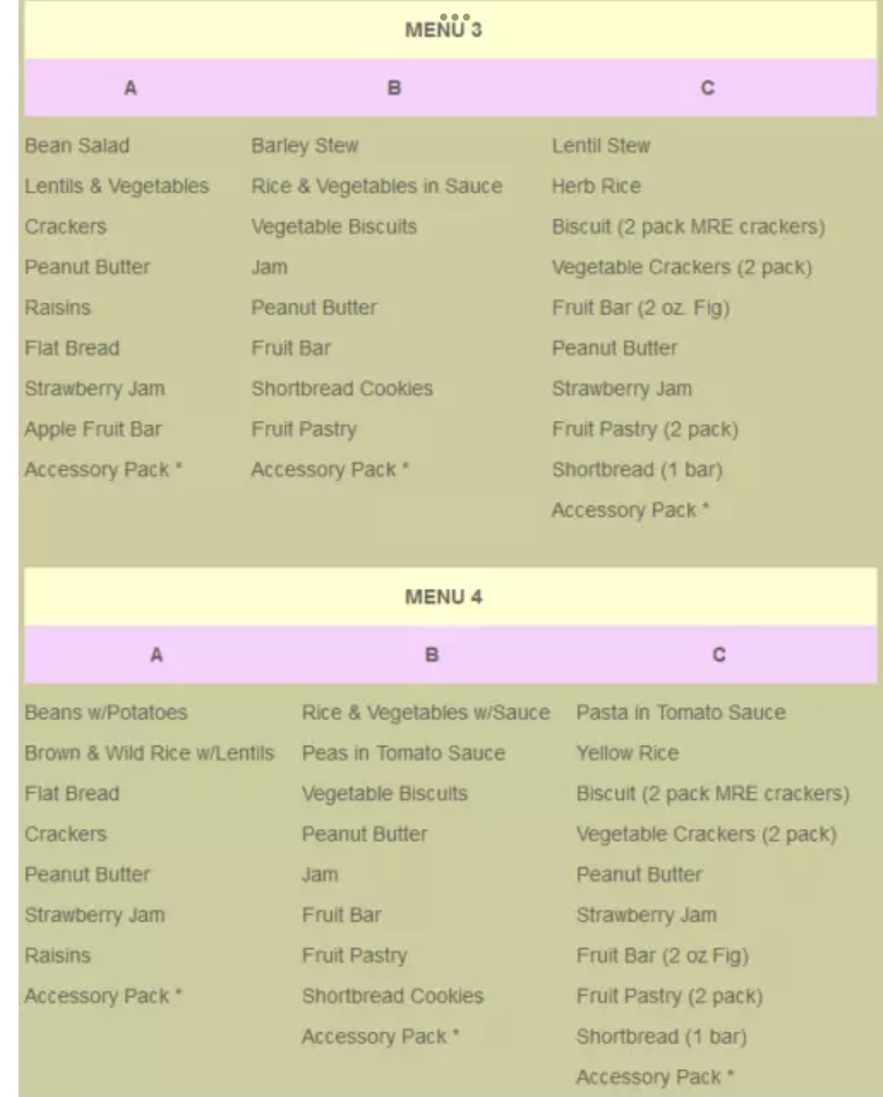 All of the meals follow menu B on the lists below, with the exceptions that in every meal the “Fruit Bar” has been replaced by an Oatmeal Cookie and the “Fruit Pastry” is an unfrosted brown sugar toaster pastry. All the jams are strawberry.