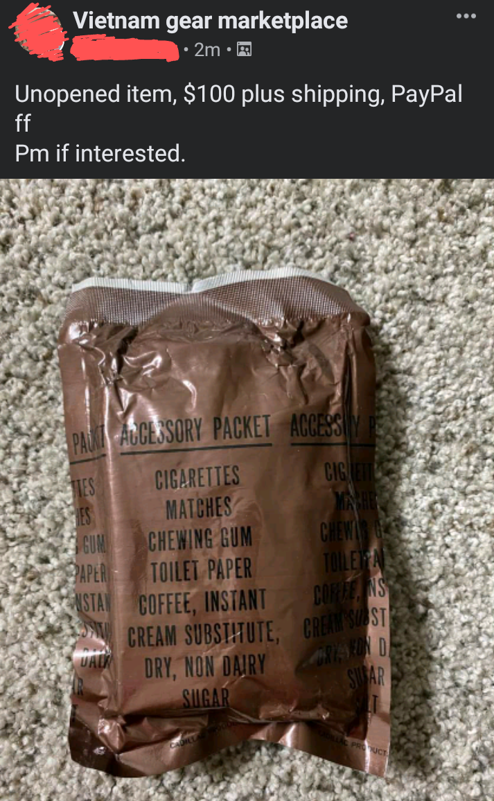 Not Ebay, but Facebook. This popped up today, $100 for a common, lots of them around, vietnam era accessory packet. Given how prominent Facebook has become in buying and selling rations through various types of collecting and marketing pages, sales like this are common. Im not aure who is buying these at this price, but in my opinion they are being taken advantage of. So much for people wanting to get into this hobby I suppose, one for the rich now i guess.