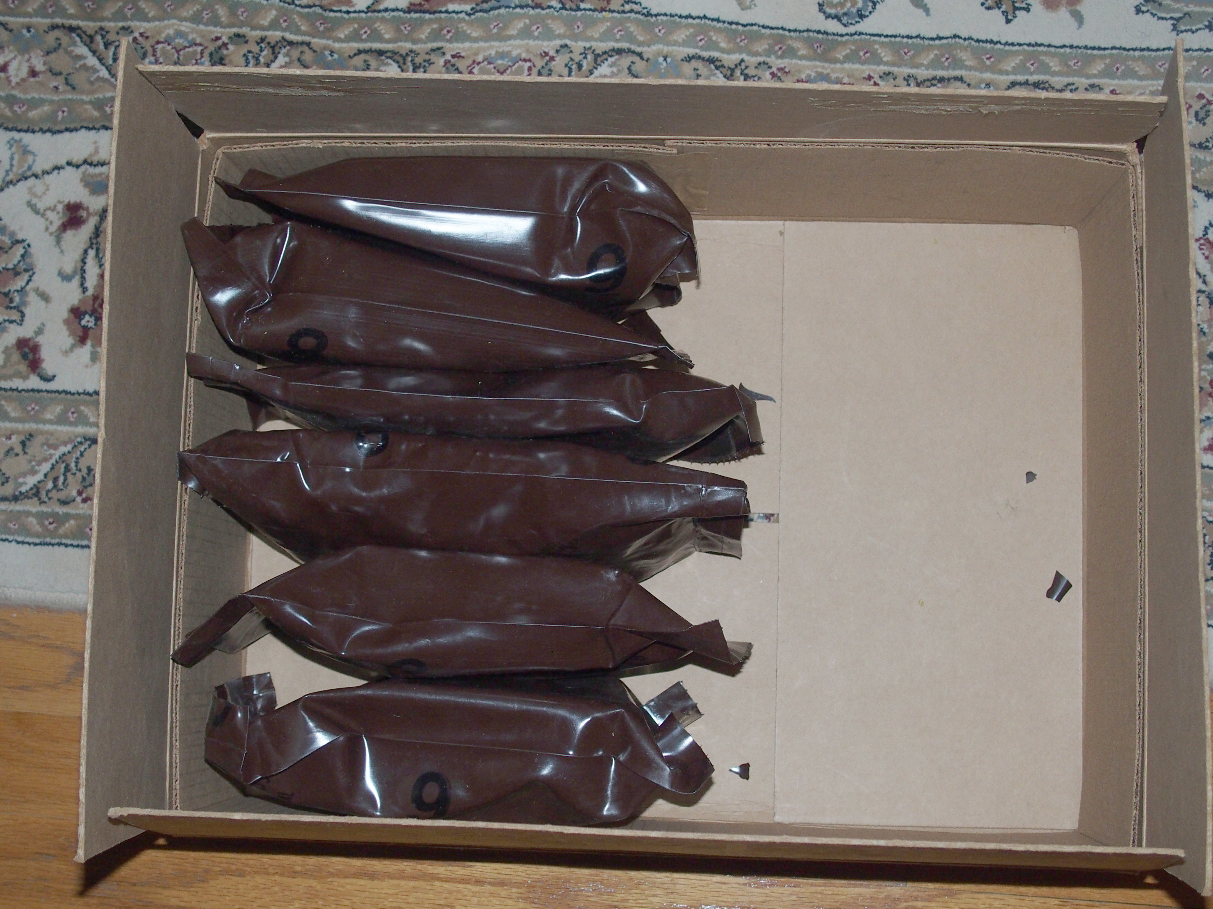 The first box on the right has a combination of Home Assembled Clear Plastic LRP's and a few "Replaced Items" Brown Pouch Home Assembled LRP's. The other two boxes are filled with the "Replaced Items" Brown Pouch Home Assembled LRP's with a few untouched brown pouches among those.