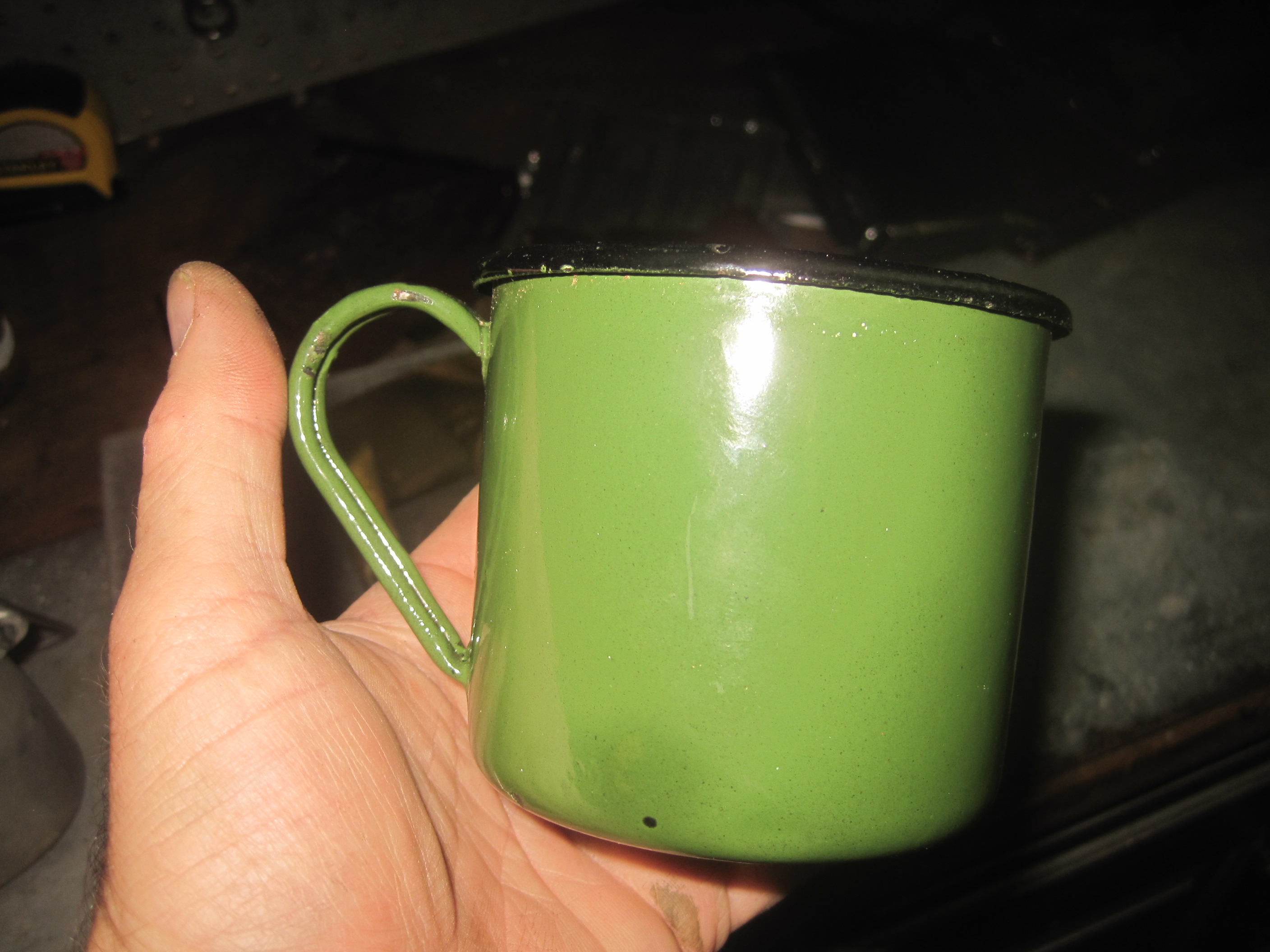 The enamel seems to have a very thick application and compares favorably to American Blue/white Enameled camping mugs of 1970's. This fits inside the Russian mess kit kettle with room to spare.