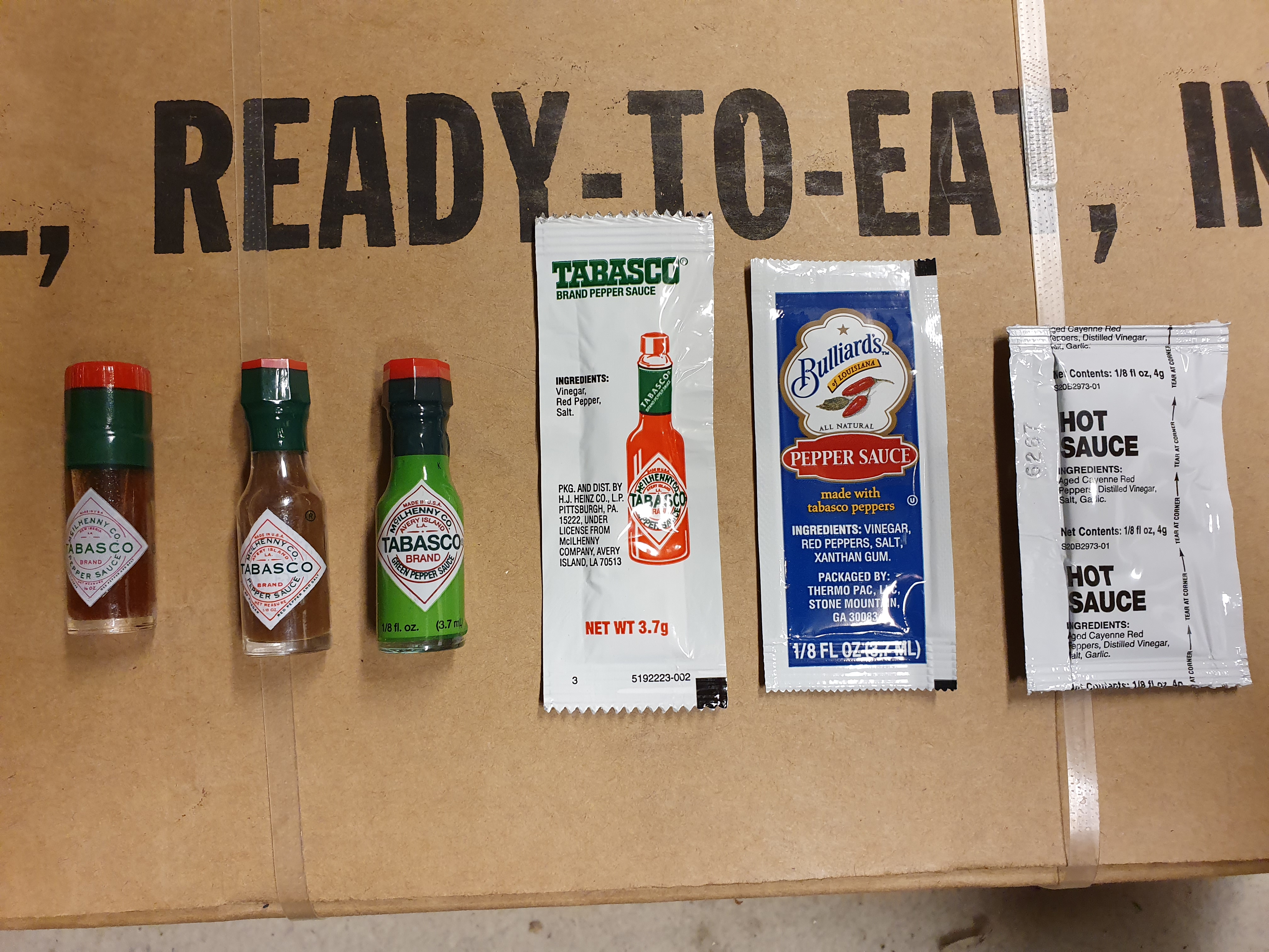 and the last for tonight is the hot sauces. the first tabasco bottle came in 1987 (the one on the far left 1987 and following time line of issued in the rations)