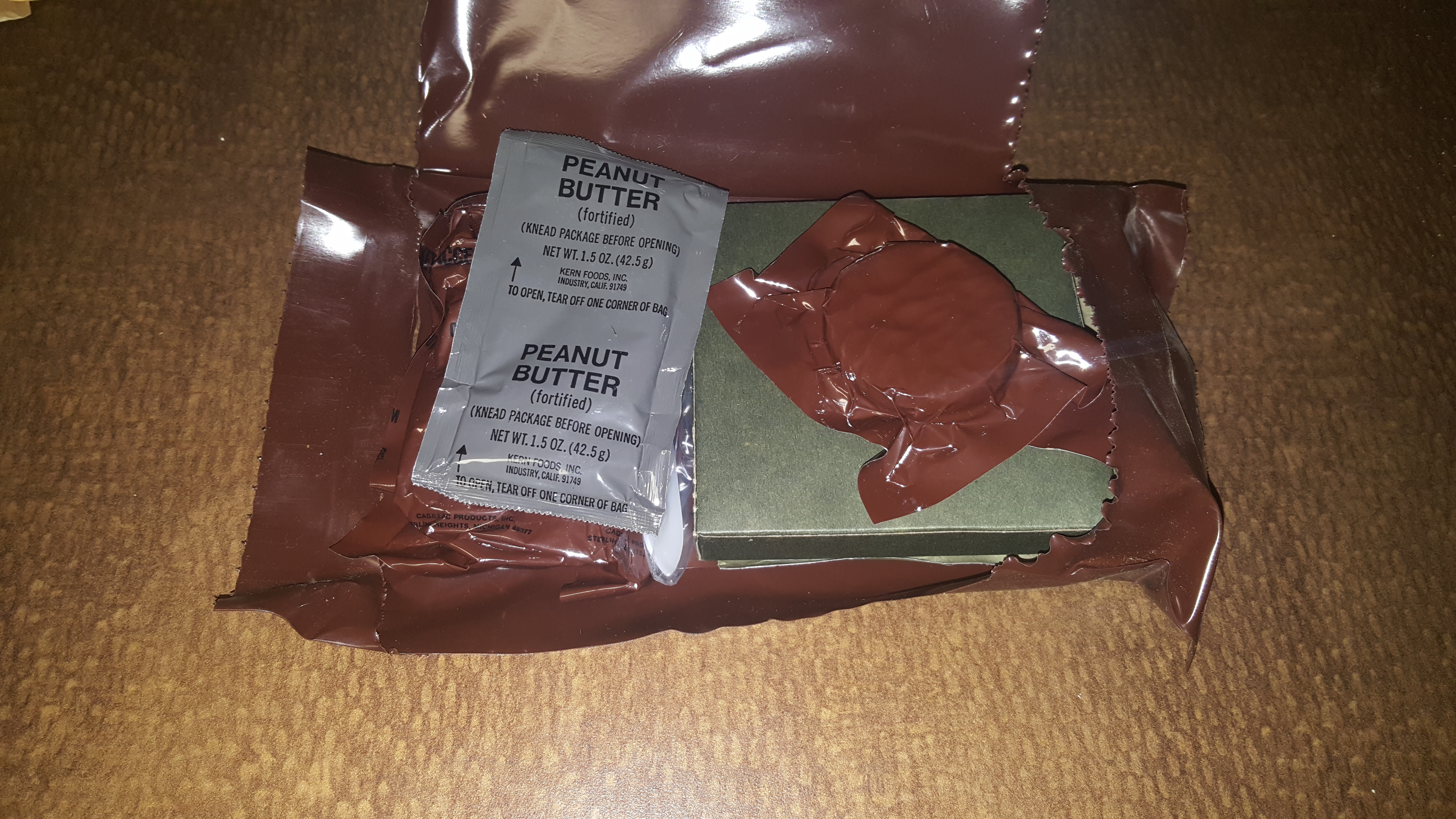 This ration includes an accessory packet, chicken loaf, peanut butter, crackers, freeze dried strawberries and a chocolate covered cookie.