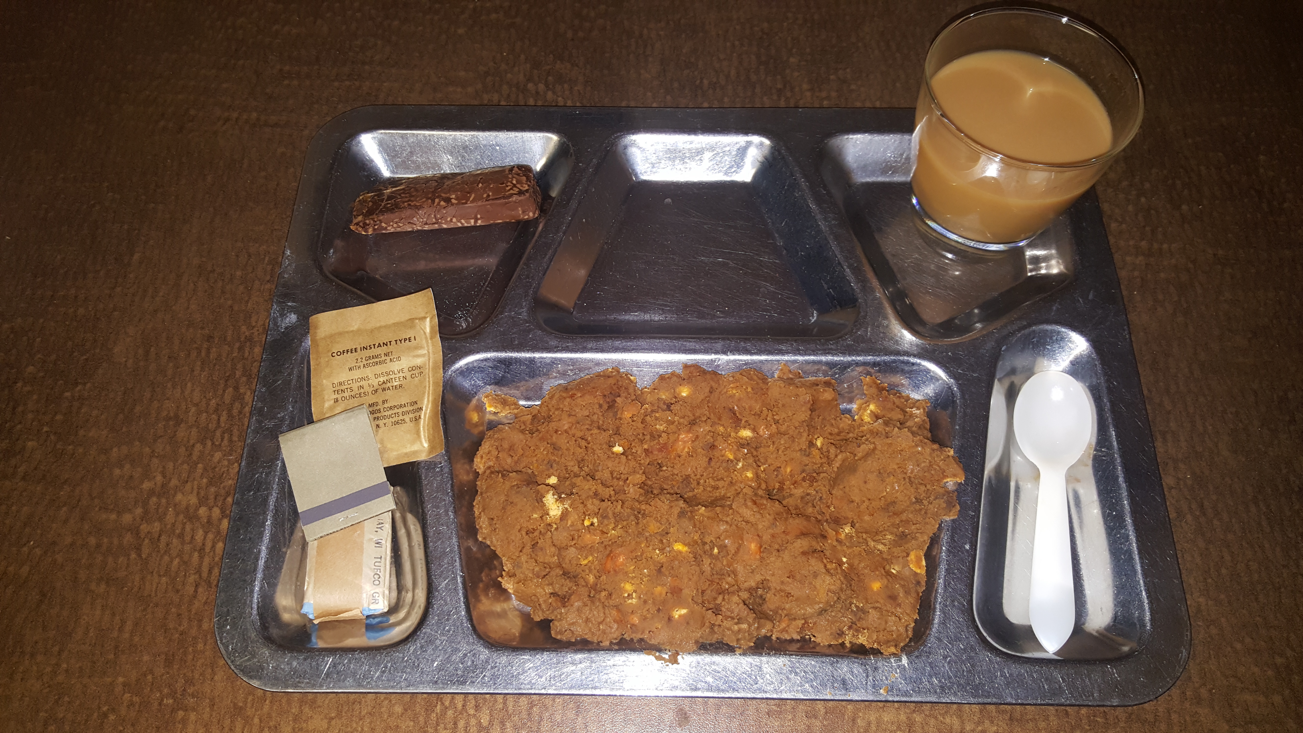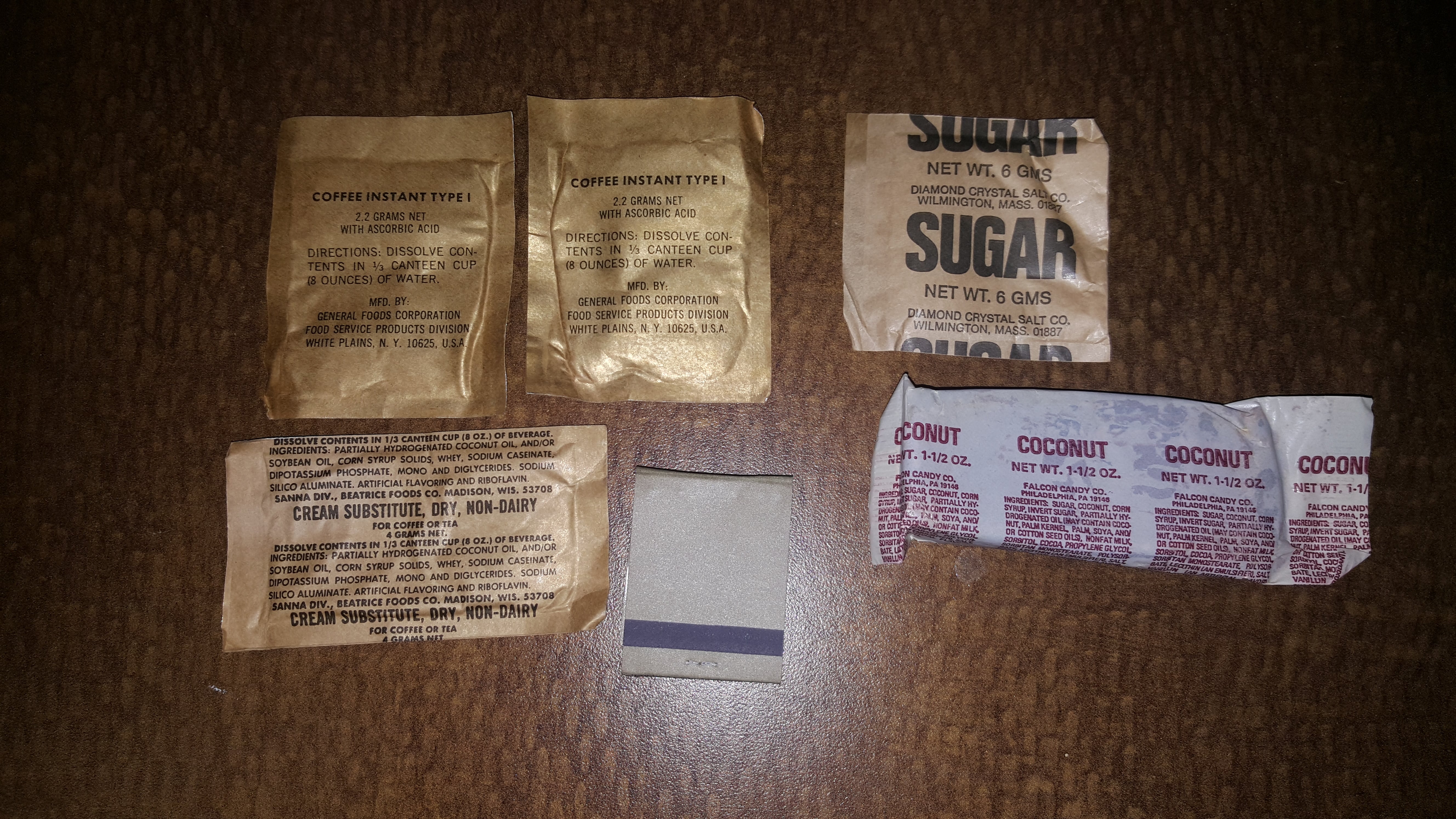 The chili con carne was actually really tasty! I could tell it had a high sodium count like many of these older LRPs do but the texture was similar to refried beans with bits of beef and pinto or kidney beans added. Some of the beans didn't rehydrate properly but I think this is pretty common because I've noticed the same thing with current production "Rice & Chicken Mexican Style" and "Chili Macaroni w/ Beef" MCWs. In fact, the flavor was somewhat reminiscent of the "Chili Macaroni w/ Beef" MCW. The chocolate on the coconut candy bar was pretty sour but I could still taste the coconut in it. I think the bar hardened up quite a bit over the years but it was very similar to a Mounds bar.