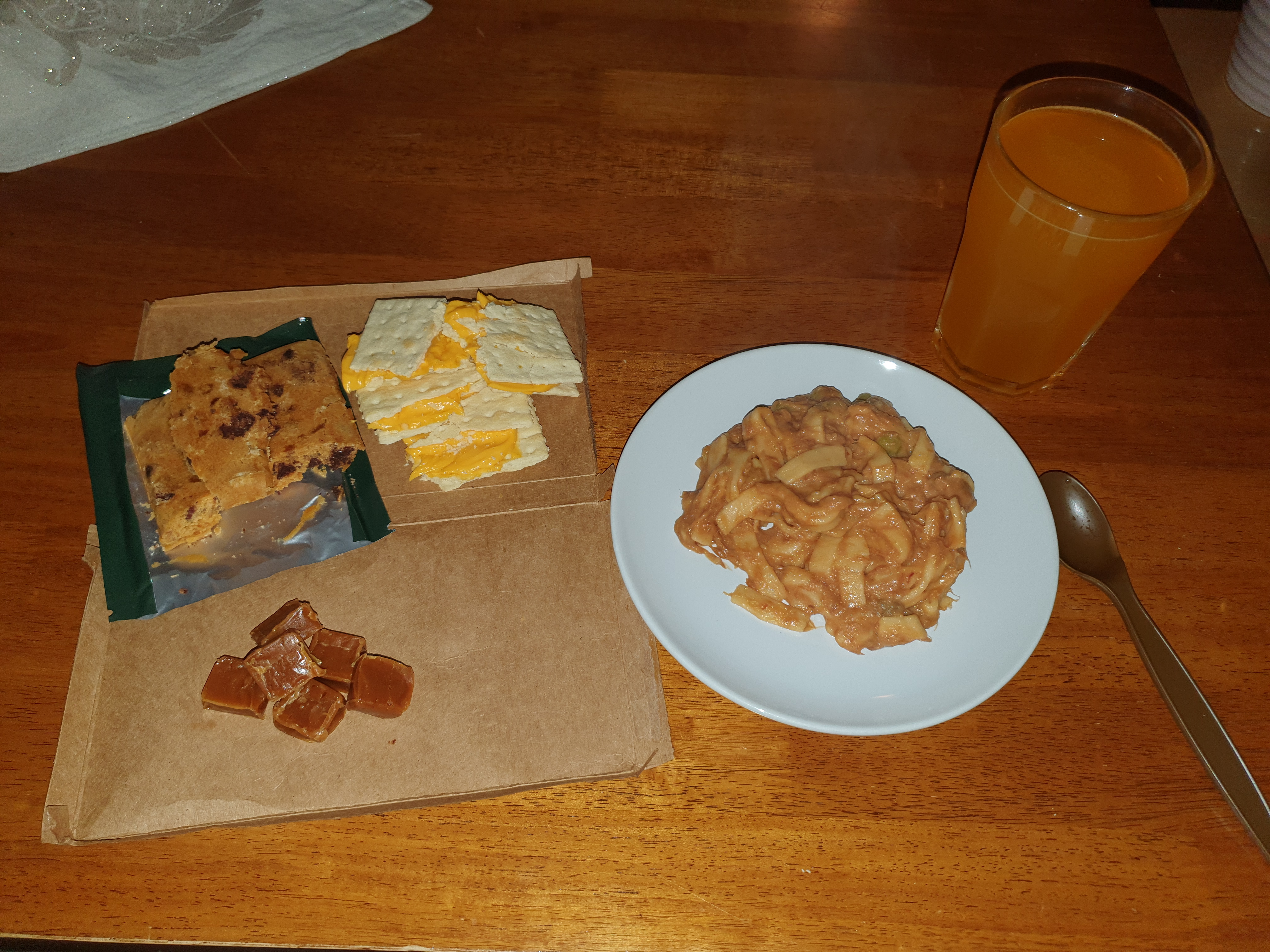 so i didnt dare to try it. the coffe was molded, orange drink was good, cockolate nut cake was yummi, crackers as usual, the cheese spread was long gone so i replaced it with fresh one.