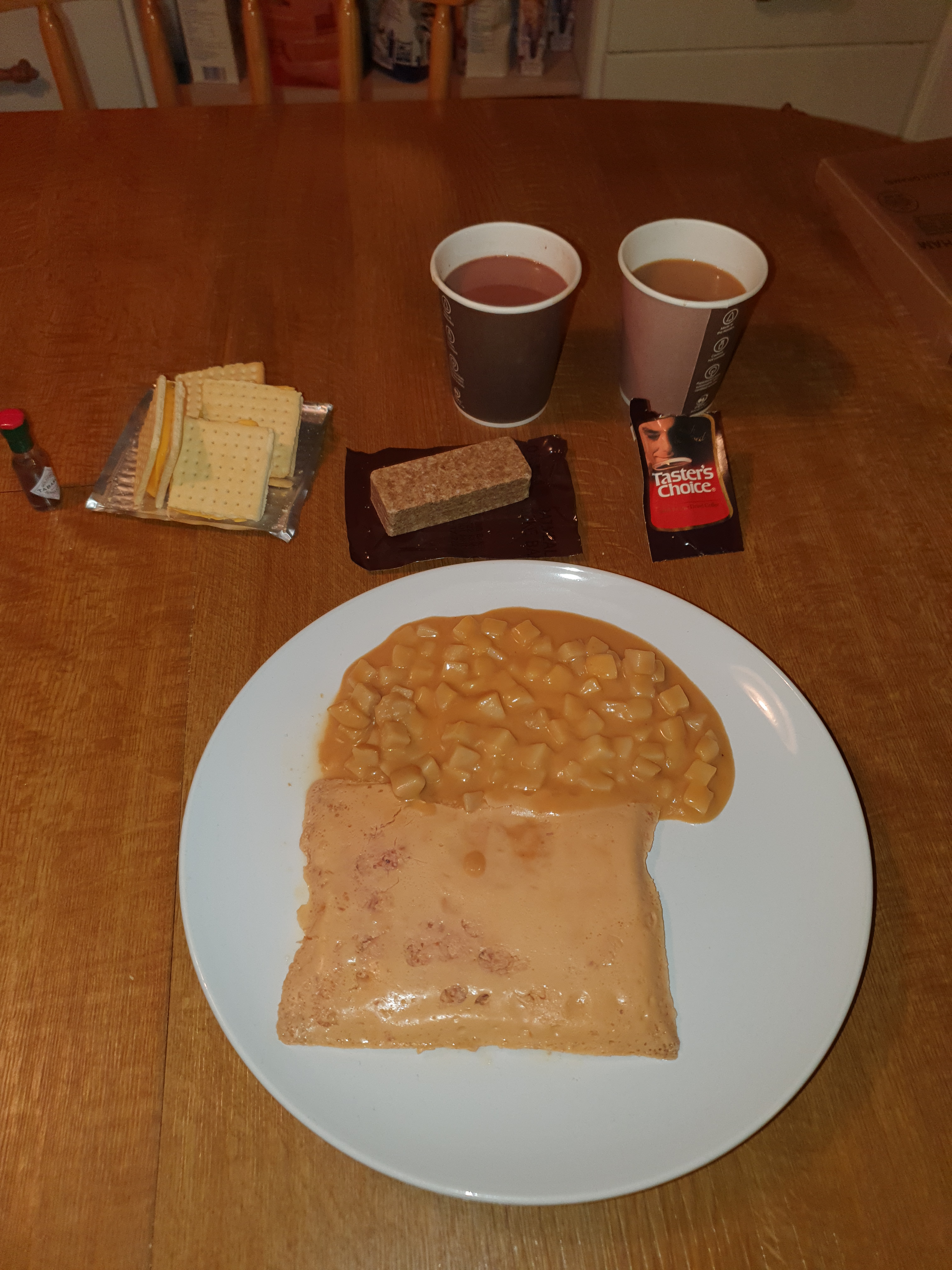 the crackers was good but added fresh cheese spread since old was not cheese anymore, coffe sugar creamer was top, cocoa beverage was top, orange drink was gone,oatmeal block perfeckt.