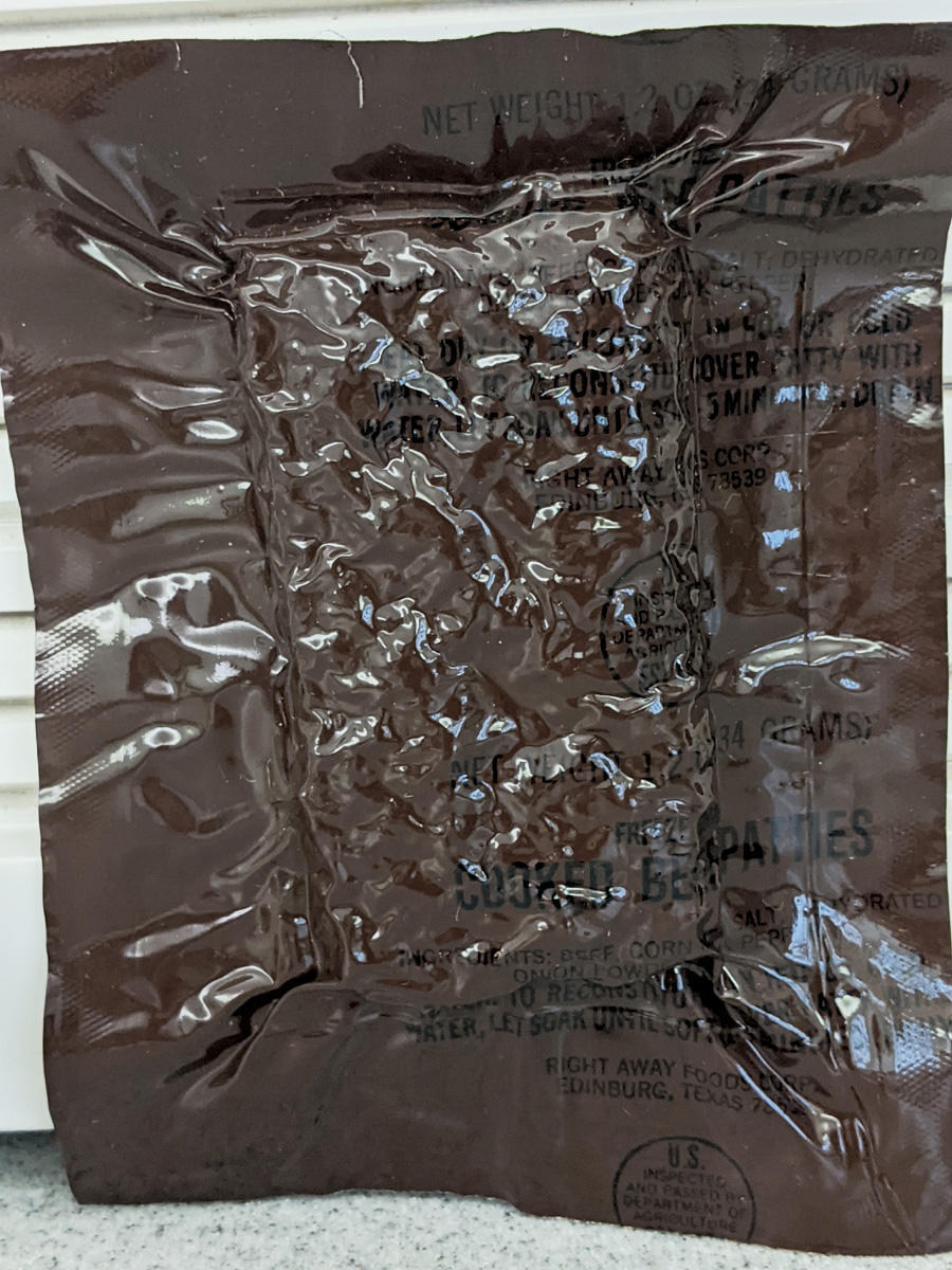I decided to try rehydrating one of the Peaches. That seemed to go well: it smelled and tasted fine. I then noticed that the smaller box that I thought just had peaches in it was actually a combination of peaches and what appeared to be individually packaged Military Grade Freeze Dried Pork & Beef.