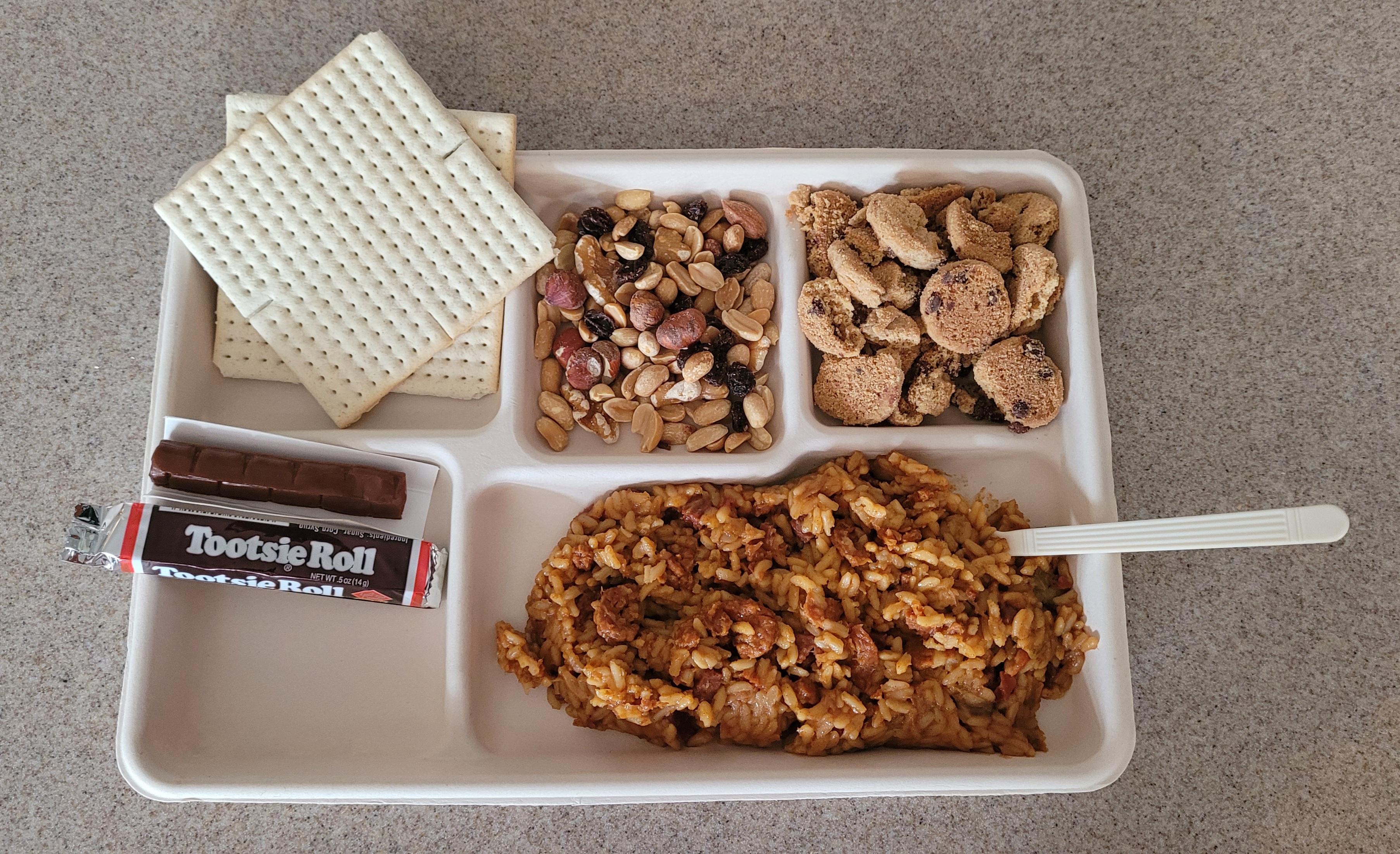 Today's lunch, a 2007 EverSafe Emergency Meal Kit menu 6 Ham and Shrimp Jambalaya. Was a little leary of this main because of the shrimp, but this meal held up really well. The jambalaya had a nice smokey flavor and had a good bit of ham and shrimp. I was surprised to find the meal still had a chew to it, not just a mushy pile. All other components were still fresh and tasty. I was a bit disappointed that it did not come with a spread for the crackers, but I put them to use eating the jambalaya