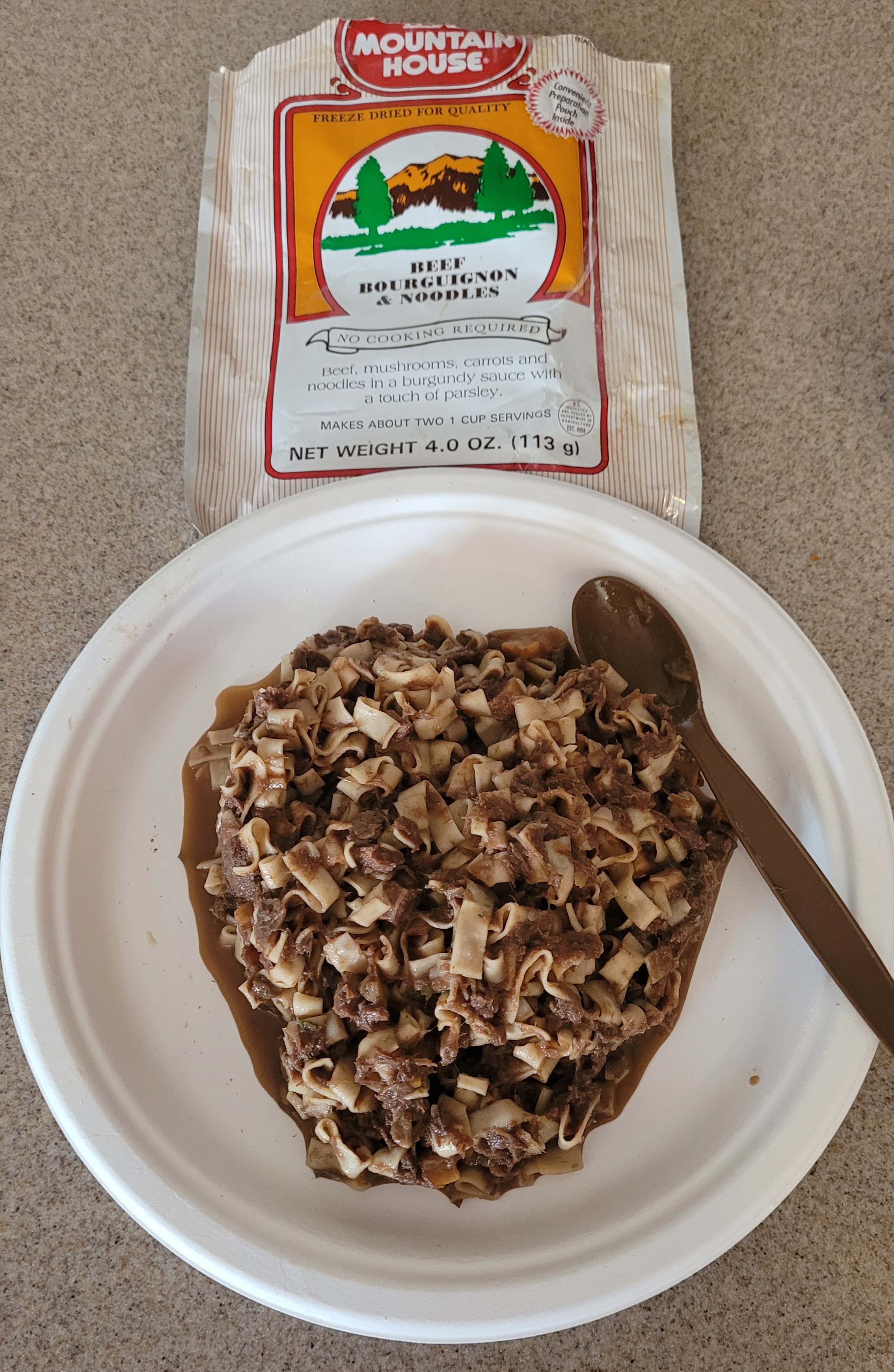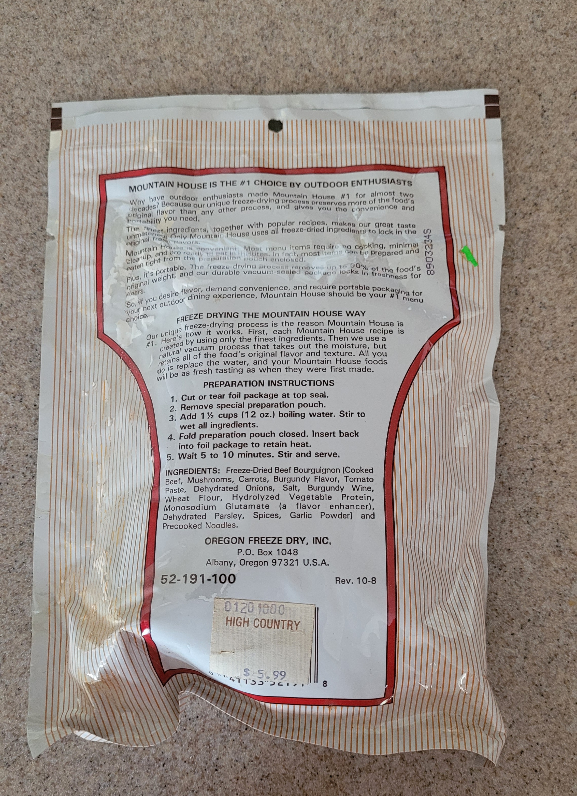 This is a 1989 Mountain House Beef Bourguignon and Noodles. I was unsure of this when I got it because it was not vacuum sealed and the package was starting to delaminate. I contacted Mountain House and they told me that it was not produced vacuum sealed. When I opened the outer package it had the classic stale smell but once I added the water that stale smell went away and the FANTASTIC smell of Beef, pasta and spices. Couldn’t wait for it to reconstitute. It was VERY good. The beef had a nice firmness, the noodles were soft but not mushy and the sauce was light and flavorful with a small hint of wine. I could see carrots and tiny pieces of onion but no sign of mushrooms. I ended up adding all 12oz of recommend water, and it was the perfect amount. I want to tell you I ate it all, but I did not. It made a HUGE pile of food