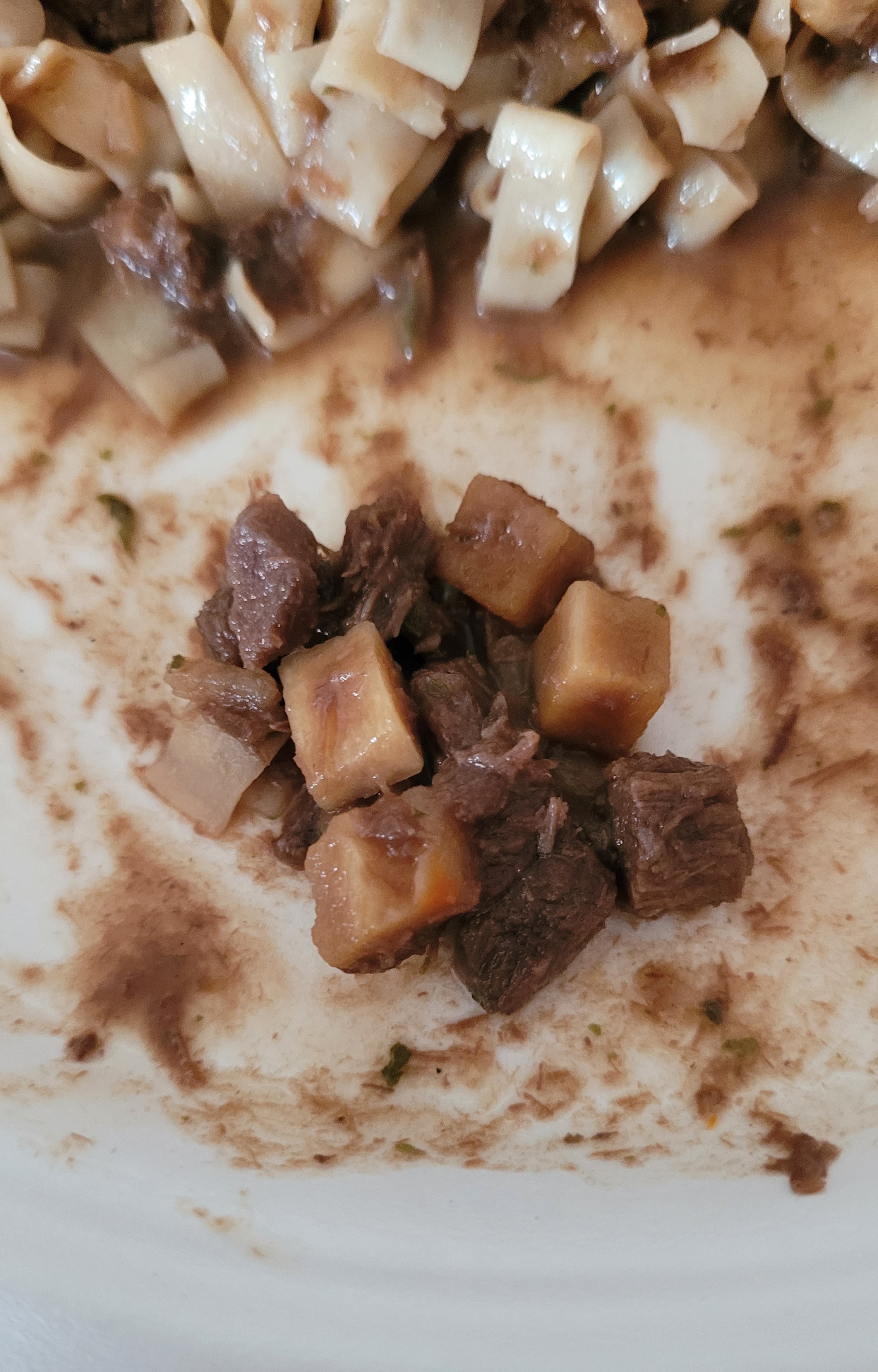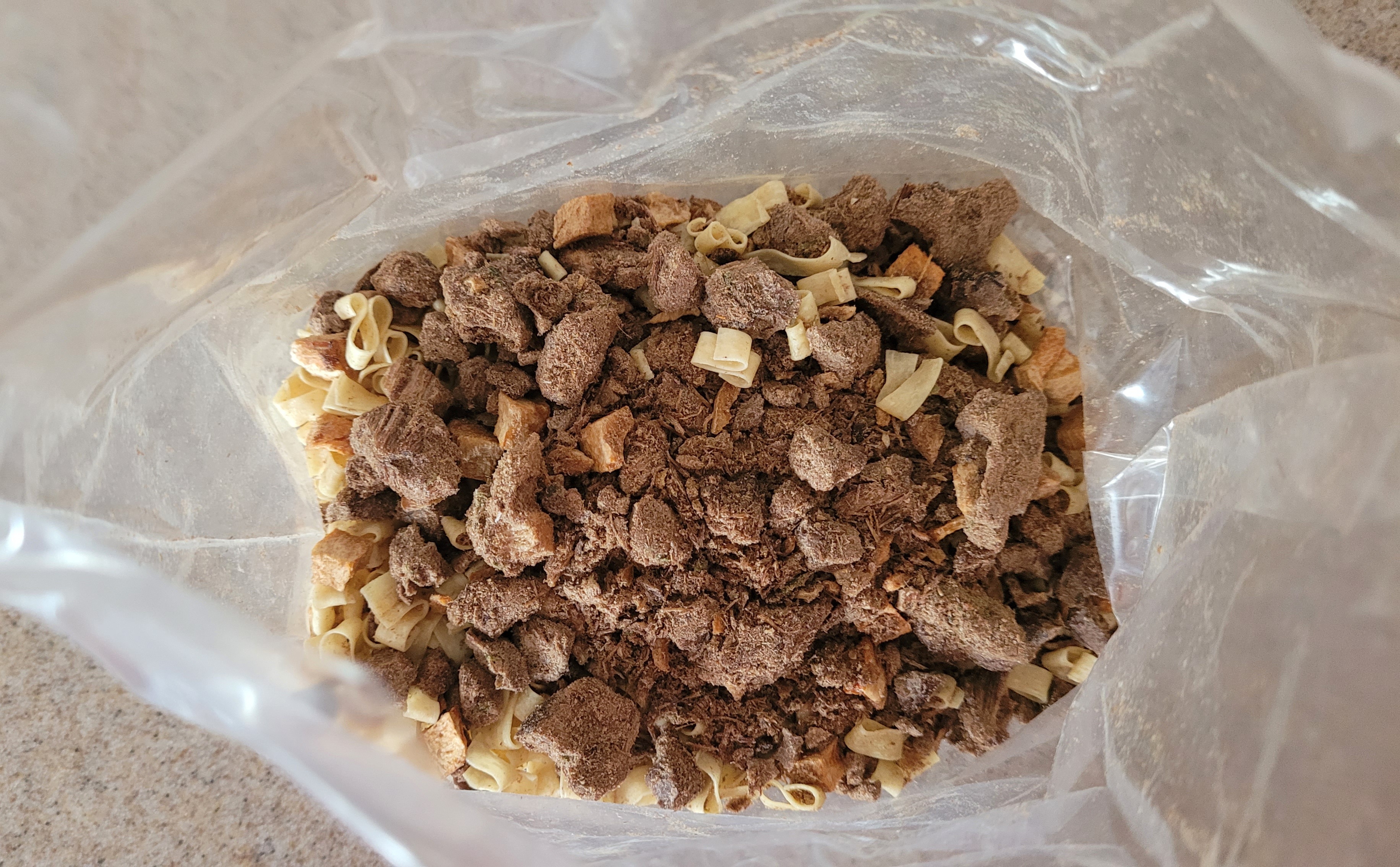 This is a 1989 Mountain House Beef Bourguignon and Noodles. I was unsure of this when I got it because it was not vacuum sealed and the package was starting to delaminate. I contacted Mountain House and they told me that it was not produced vacuum sealed. When I opened the outer package it had the classic stale smell but once I added the water that stale smell went away and the FANTASTIC smell of Beef, pasta and spices. Couldn’t wait for it to reconstitute. It was VERY good. The beef had a nice firmness, the noodles were soft but not mushy and the sauce was light and flavorful with a small hint of wine. I could see carrots and tiny pieces of onion but no sign of mushrooms. I ended up adding all 12oz of recommend water, and it was the perfect amount. I want to tell you I ate it all, but I did not. It made a HUGE pile of food