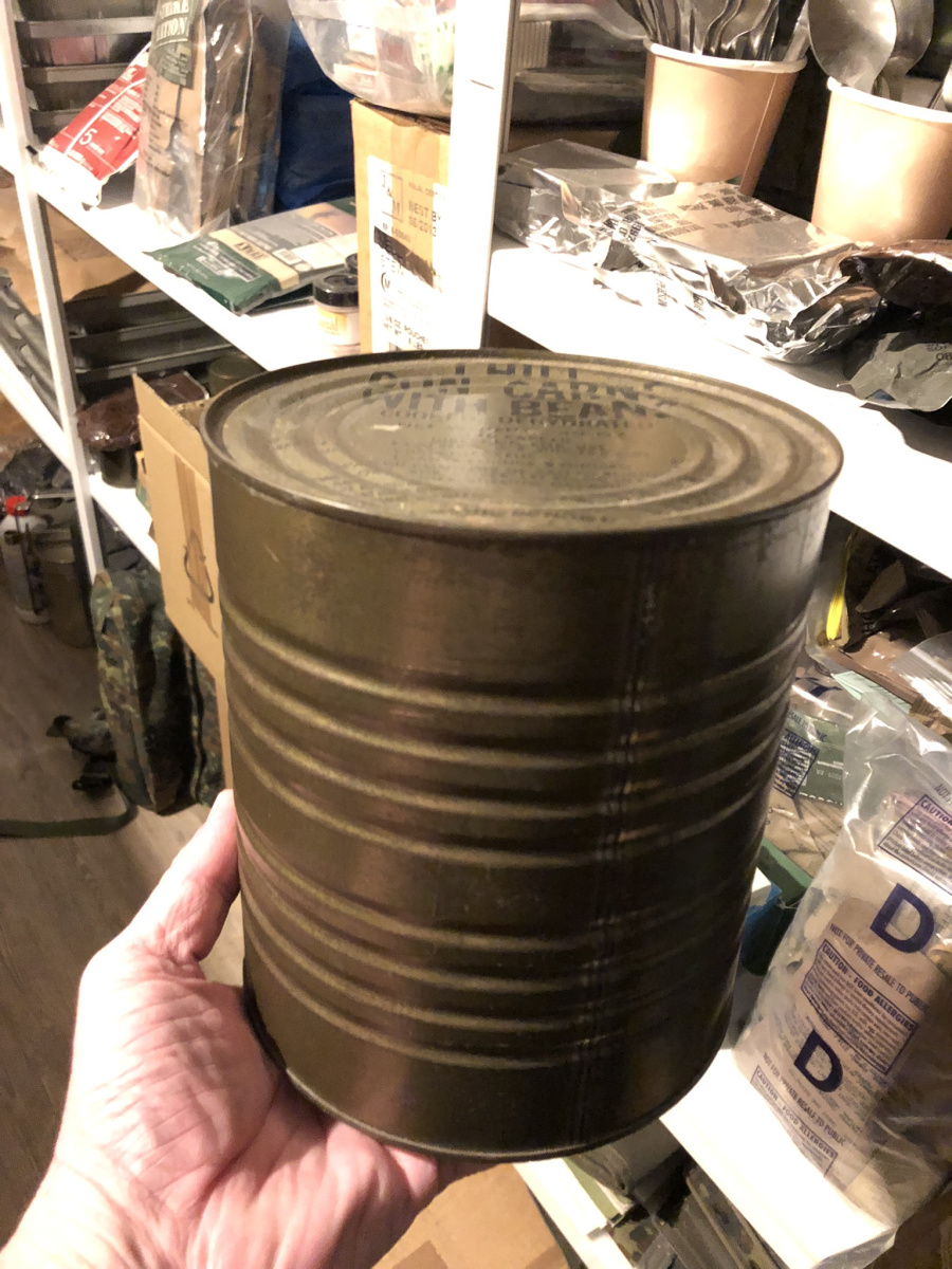 I have one of these B-Ration cans:cavguy wrote: Sat Jan 29, 2022 5:38 pm I wish I had facts to point to... But I have always thought these cans were likely from the 1970's to late 1980's. I think cans from the Vietnam era and before were green in color (including these large #10 B-Ration cans). I once had a #10 can of dehydrated chili with beans that was green in color before, I mixed the contents with boiling water and it tasted perfectly fine.