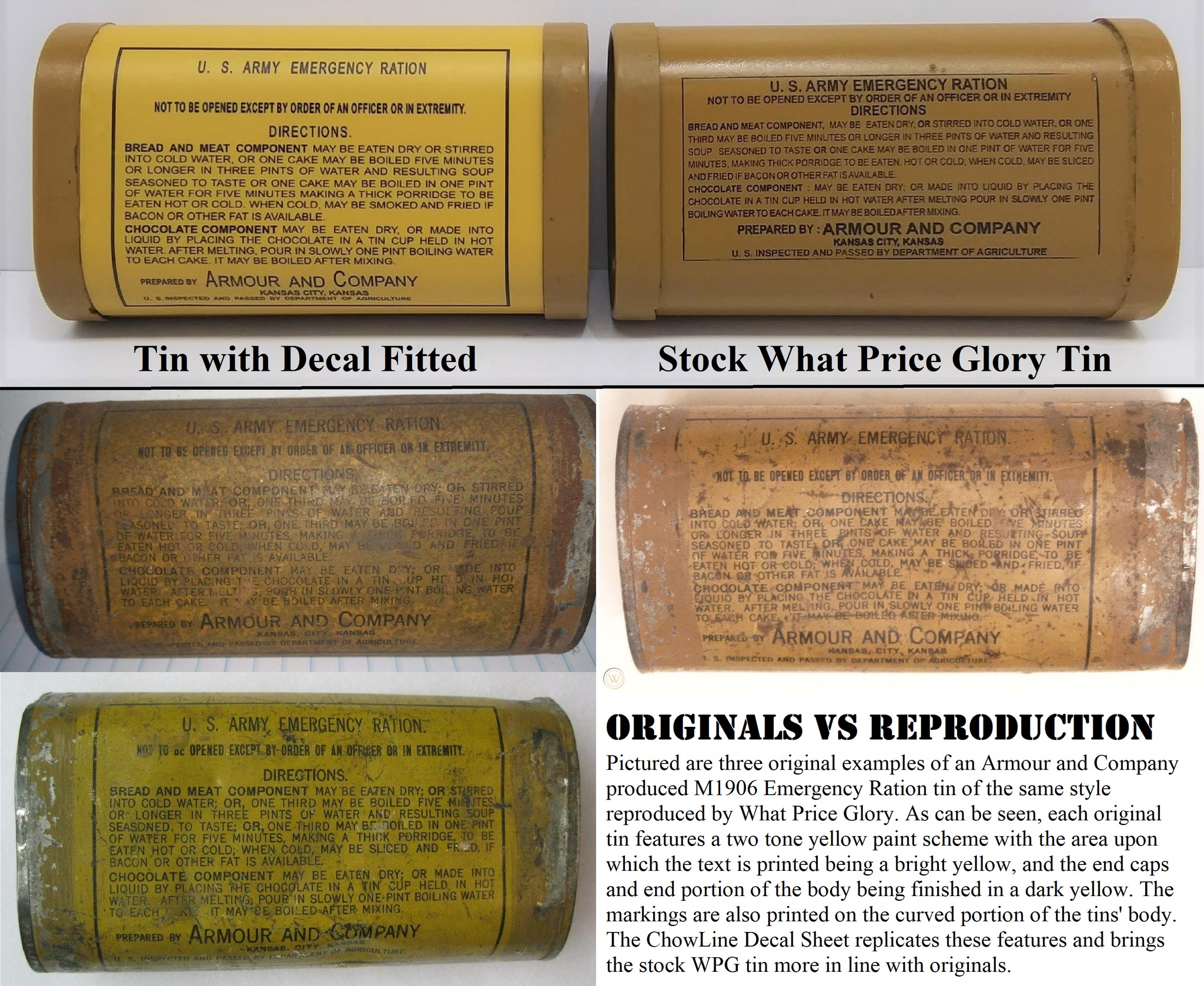 These photos are of production version decal sheets affixed to a WPG Emergency Ration tin. While the originals were painted on, the decals are thin and mimic the appearance of painted/ lithographed markings quite well (see photo comparing a painted tin vs a tin affixed with a decal.