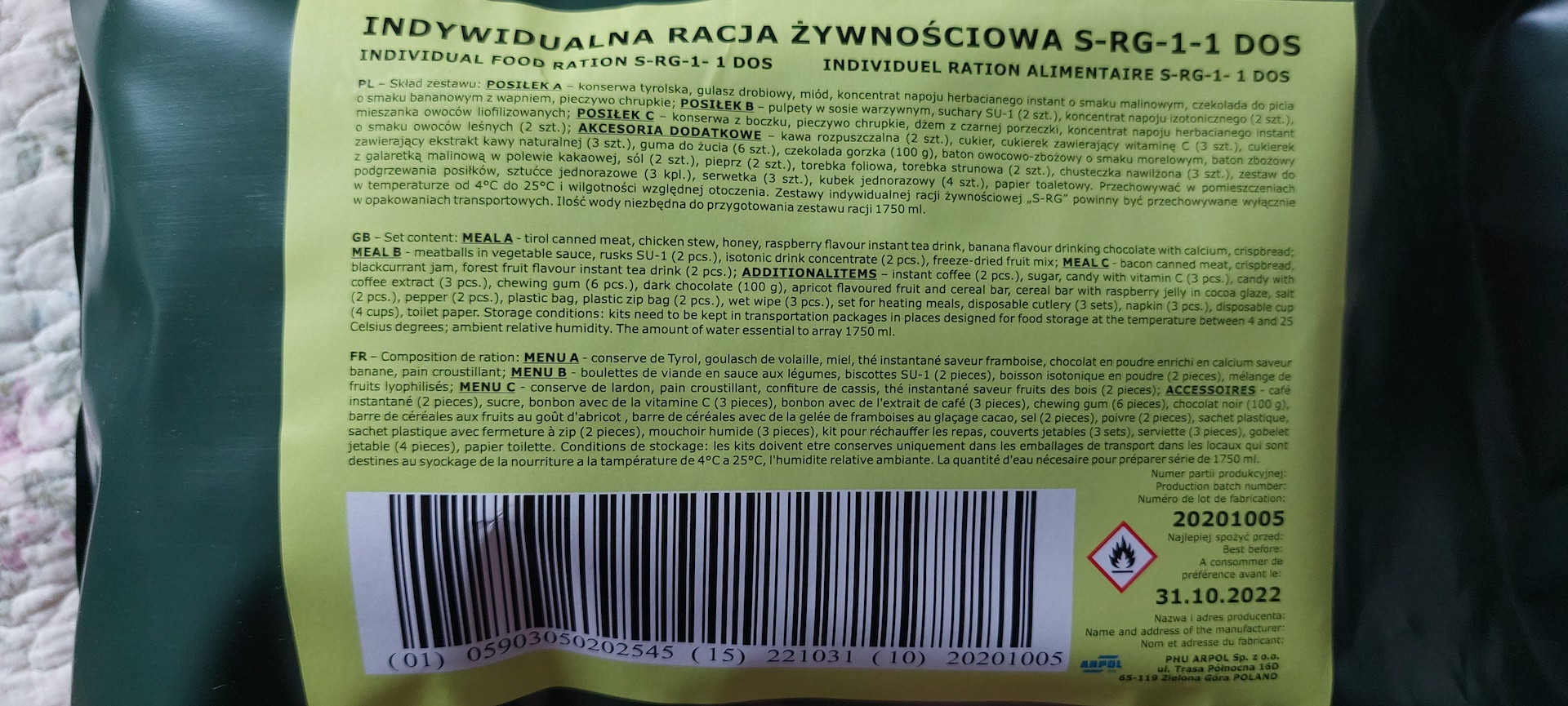 I have some fresh Polish army 24h rations -SRGs, best before date -end of Oct 2022. Menu 1 and 7