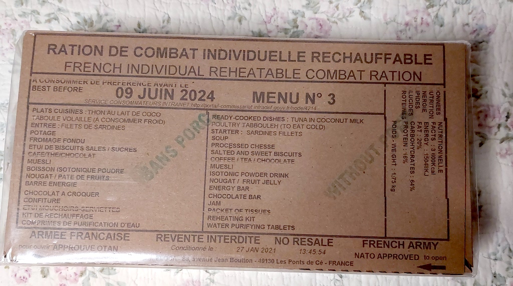 I have 1 French 24h RCIR ration for sale. Very fresh- best before June 2024.