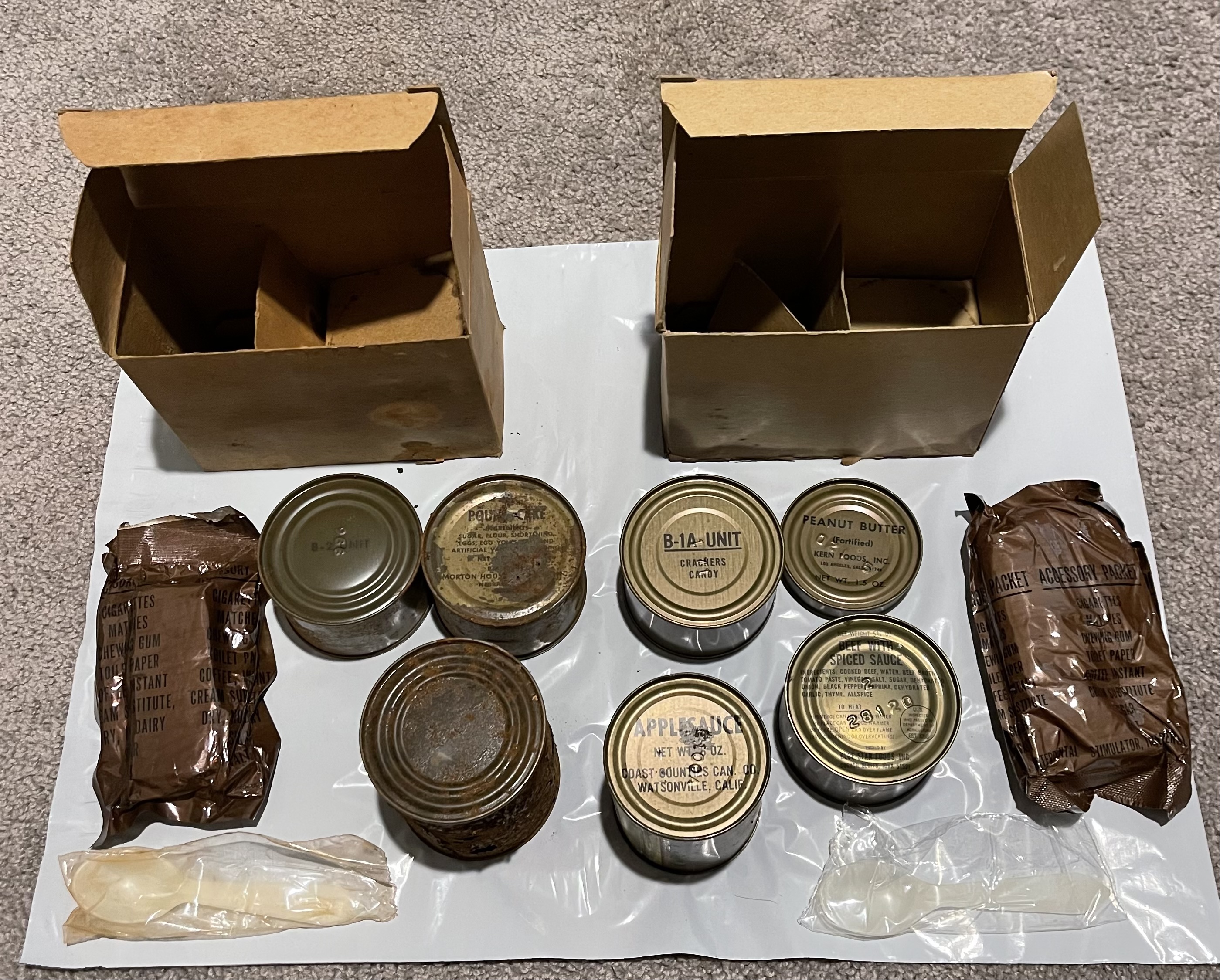 This one is the complete opposite of the first with everything being in amazing condition. All cans are sealed with only the applesauce showing a tiny leak. Accessory packet and spoon are sealed tight. B unit date indicates 1971 production.