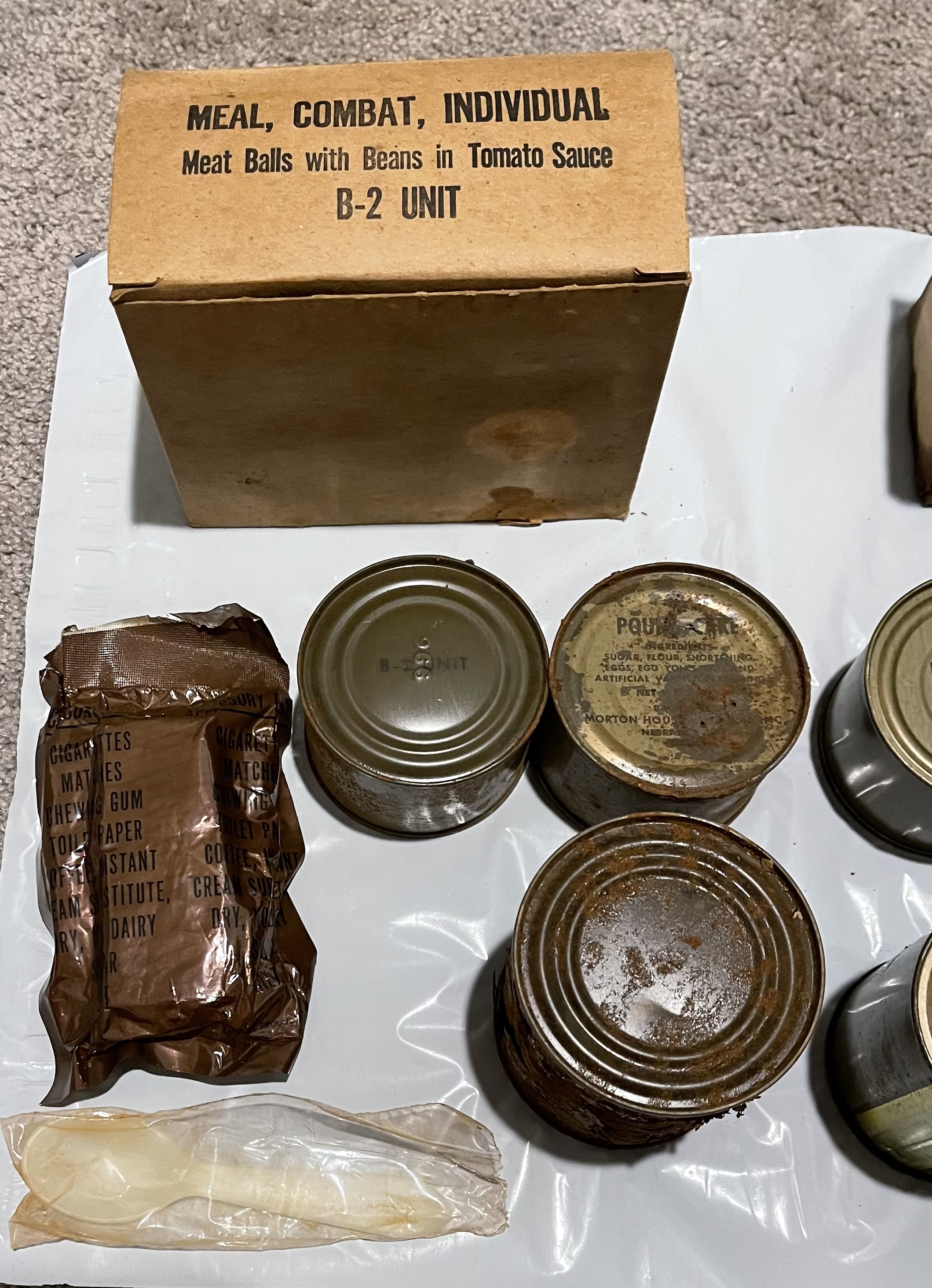 This one is in rougher shape with the main and pound cake both rusted through the can. The B-2 unit is slightly rusty but still sealed. The accessory packet and spoon are sealed in their respective bags. B unit date indicates 1966 production.