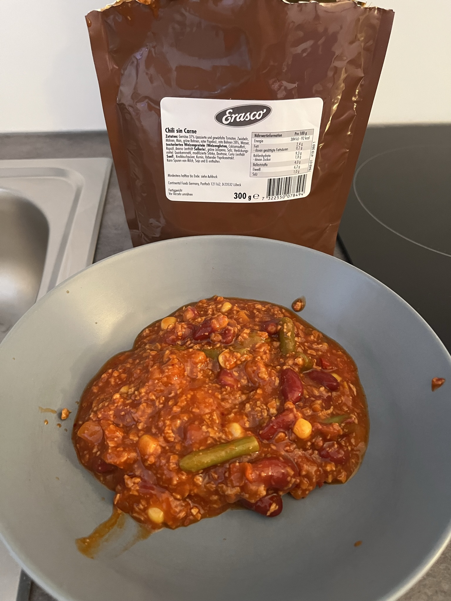 Since a couple of years, EPas also got a "best by date" and do not longer have a production date on. That one is best by 2022 The opened pouch, nothing spectacular to mention so far Heating up in the microwave After eating, I reread the ingrediens and noticed it say "sin Carne", not "con Carne" so it´s a vegetarian meal. I didn´t noticed it by taste nor texture