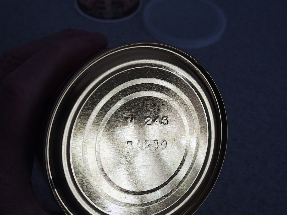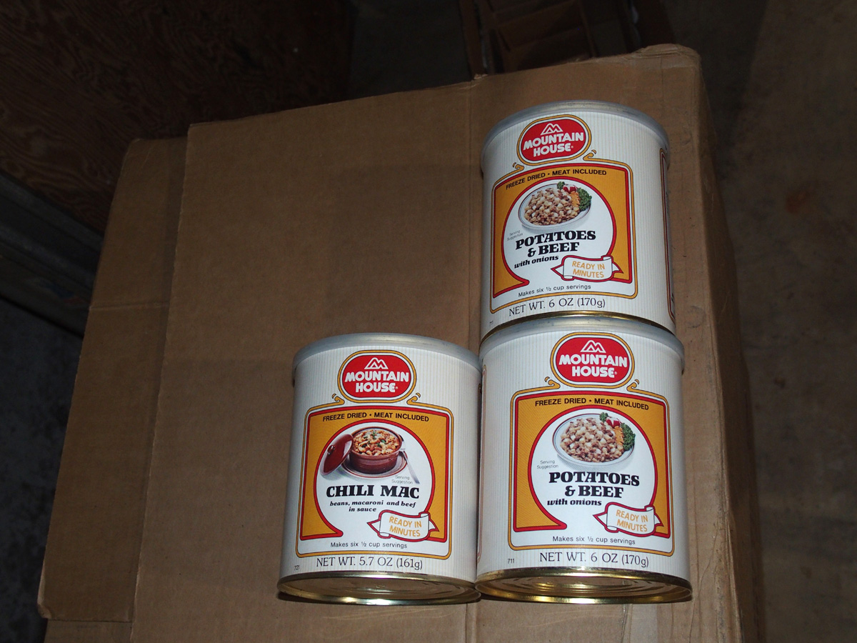 A #2-1/2 Can of Chili Mac and a couple of #2-1/2 Cans of Freeze Dried Potatoes & Beef. Note the "correction" pasted to the bottom of the cans of Potatoes & Beef. All of these are "L" date codes indicating being packaged in 1981.