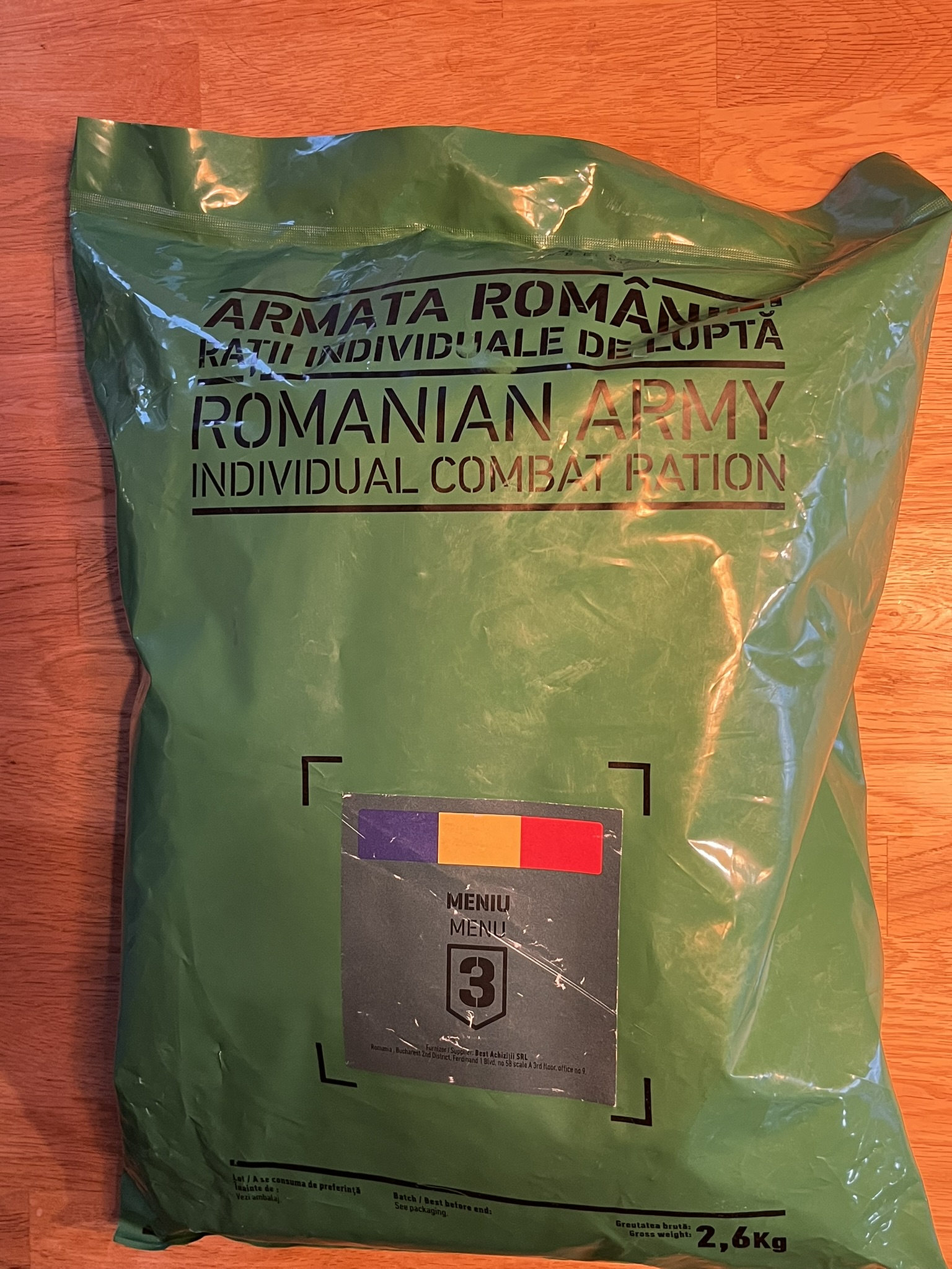 Newer romanian rations are provided by FoodForce/Serac out of Sweden, they come in a tan bag similar to this