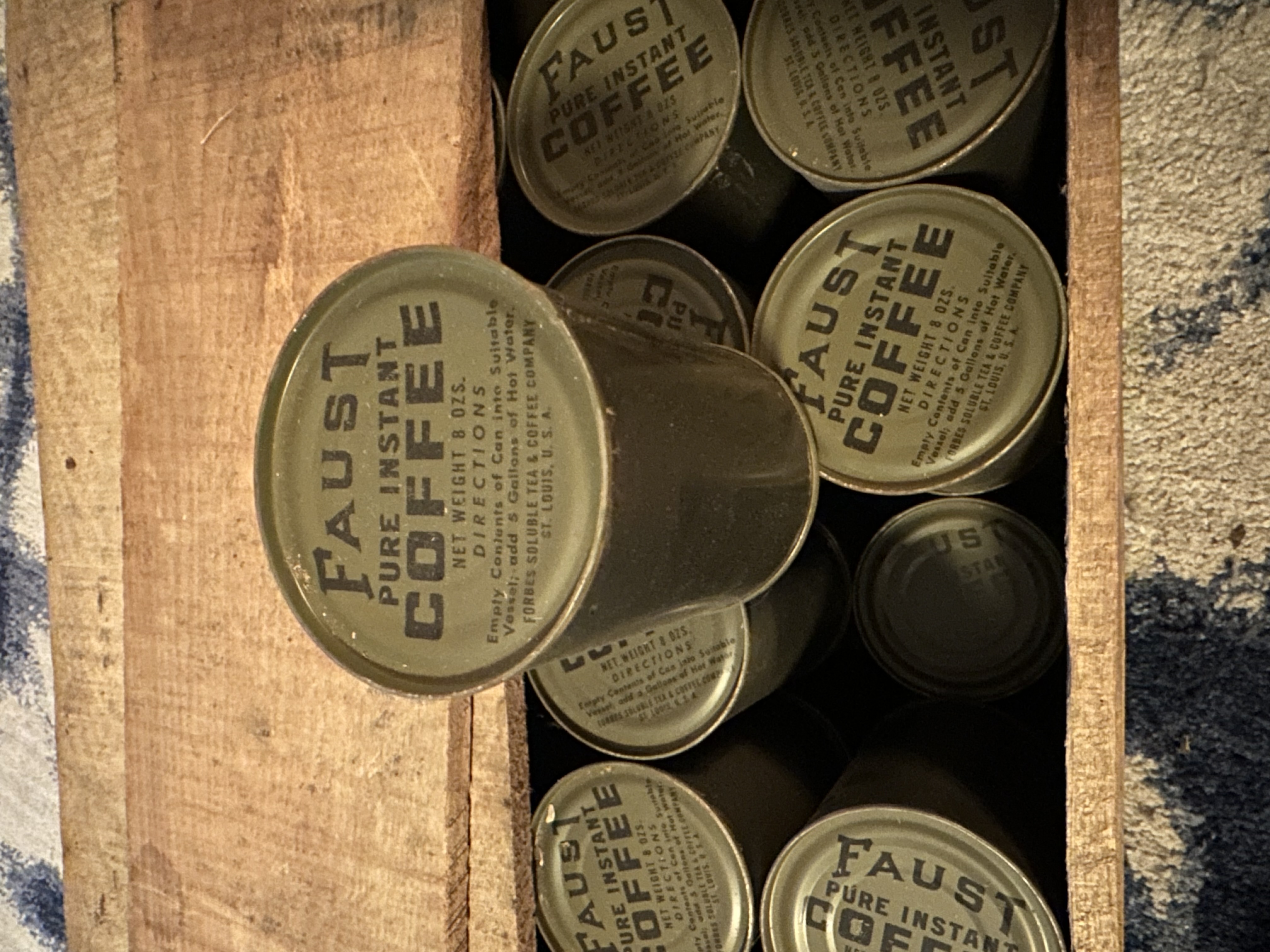 Hey everyone, I’ve got a bunch of sealed Faust Coffee cans for sale! The crate dates these cans between March-June 1945 and they were produced by the Forbes Soluble Tea and Coffee Company. The cans have some normal wear for their age but are in overall great condition and the coffee inside is dry and loose. I have them listed on eBay, but am offering them here for a discount since eBay takes a good chunk for themselves.
