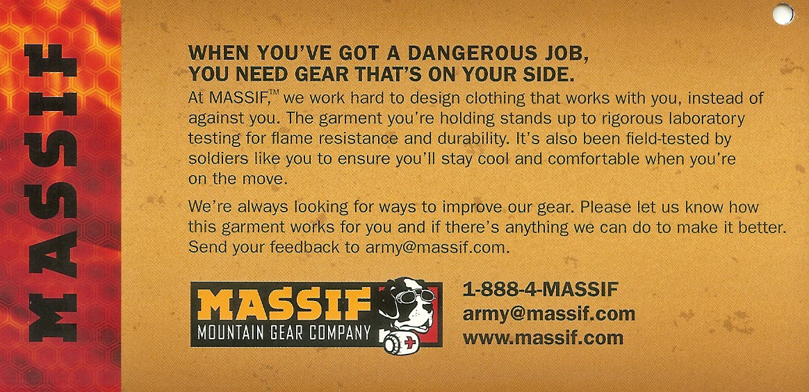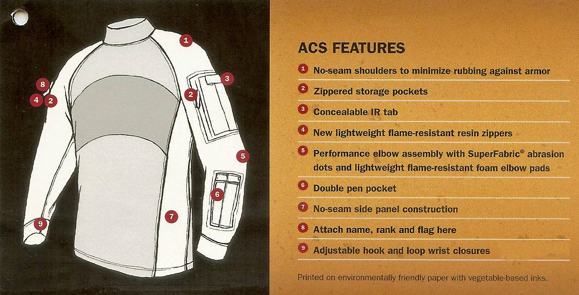 Lorie:Massif wrote:The Army Combat Shirt is approved for use by the Army. It was developed at the Army's request by Massif Mountain Gear Company in an effort to create a lightweight, breathable, flame-resistant shirt for wear under body armor in really hot weather. The torso is a super light, stretch fabric, while the sleeves provide added protection but are still breathable.
