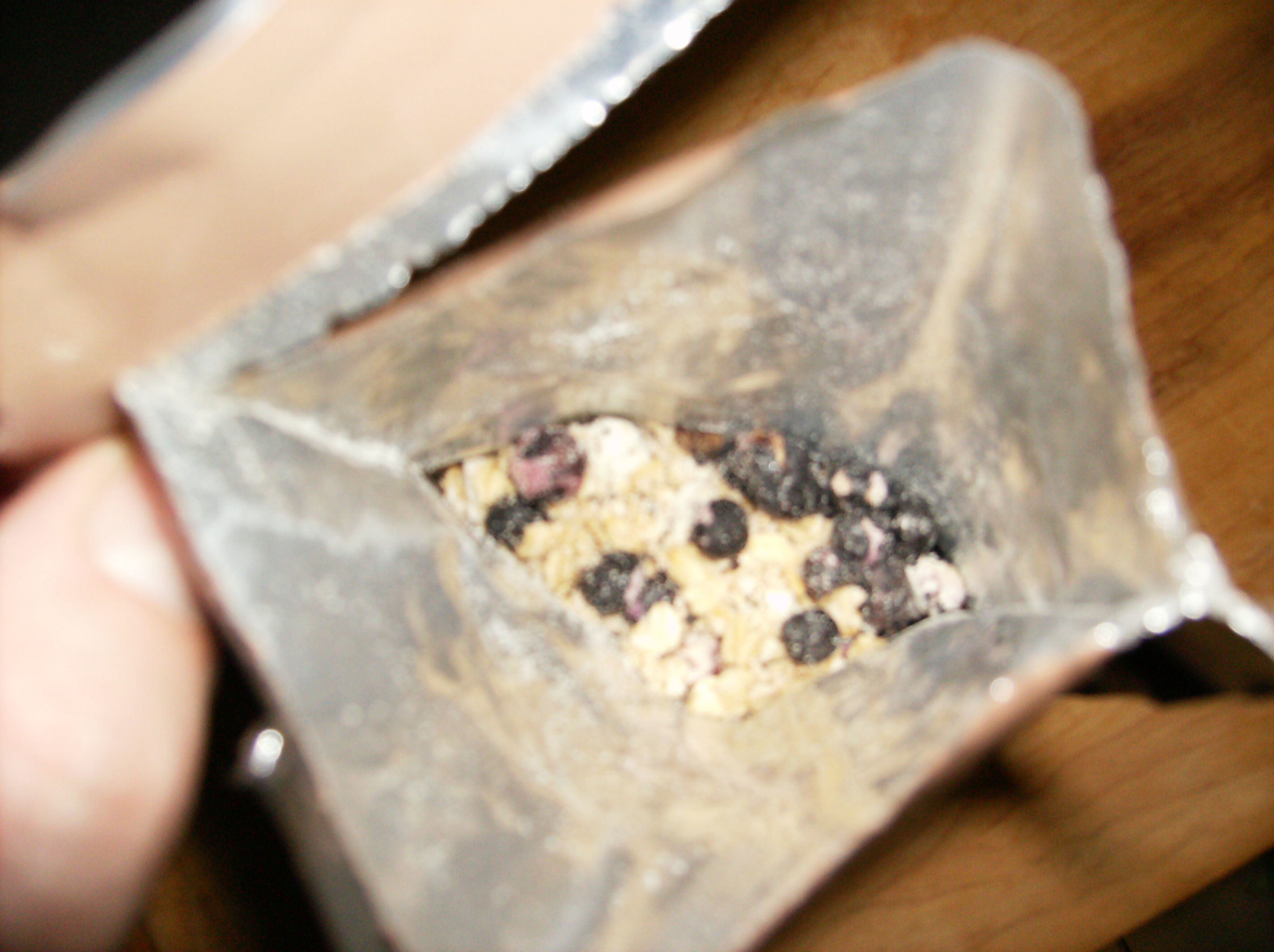 Granola, Dehydrated with Milk and Blueberries: Okay, at first it didn't look like much. Kind of like muselix with some bluberries thrown in ( pic 1 ). The package said to add 2-4 oz (59.14 ml -118.29 ml) of cold water and let sit, then stir and consume within one hour. Well, I figured if it's dehydrated, then I might want to add hot water to re-constitute it a little quicker. So I put in 4 oz, and let it sit for 10-12 mintues. The result was a bit different (pic 2). The taste was really another matter,