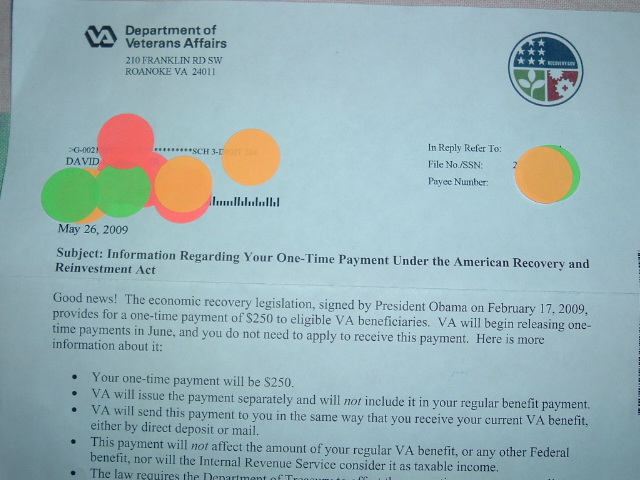 I got this letter in the mail today, 26 May. 2009. I'm 20% disabled and receive a monthly pension from the V.A. I know where I'm going! The next local gunshow, and buy me 5 cases of MRE's.